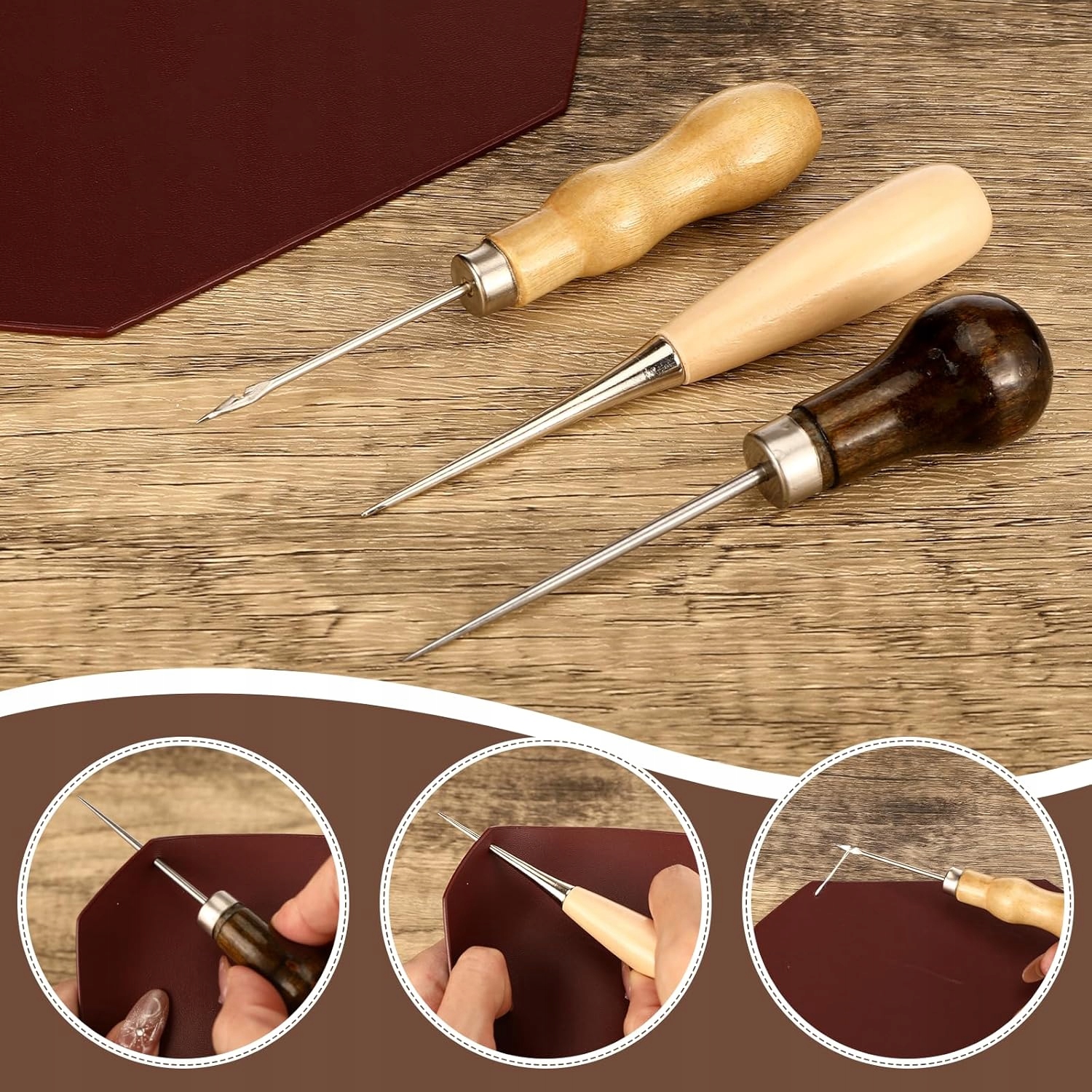 【Аксессуары для шитья кожи】: Комплект для шитья кожи содержит три вязания крючком с различными функциями: длинные прямые удары, расчесывание царапин и набросок с крючком для зацепления и шитья. Szydło изготовлен из высококачественного металла с деревянной ручкой, которая является гладкой и удобной. Это может быть идеальным подарком для родителей, друзей и особенно любителей ремесла.