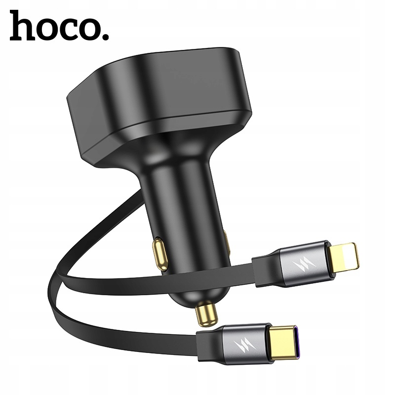 hoco NZ13 Clever b> — это быстрое и мощное автомобильное зарядное устройство с телескопическим кабелем 2-в-1 с двумя разъемами: один USB Type/Type C/USB-C/Type-C, а другой предназначен для iPhone Lightning. Максимальная мощность зарядки с помощью кабеля USB Type C составляет 30 Вт, максимальная мощность зарядки с помощью кабеля iPhone Lightning — 27 Вт. Максимальная суммарная мощность зарядного устройства при использовании обоих кабелей и одновременной зарядке двух устройств составляет 15 Вт. Зарядное устройство дополнительно имеет все защиты по току и перенапряжению, а также сертификаты, разрешающие продажу и использование в Европейском Союзе. Длина кабеля, идущего в комплекте с зарядным устройством, составляет около 90 см, он оснащен светодиодным индикатором.