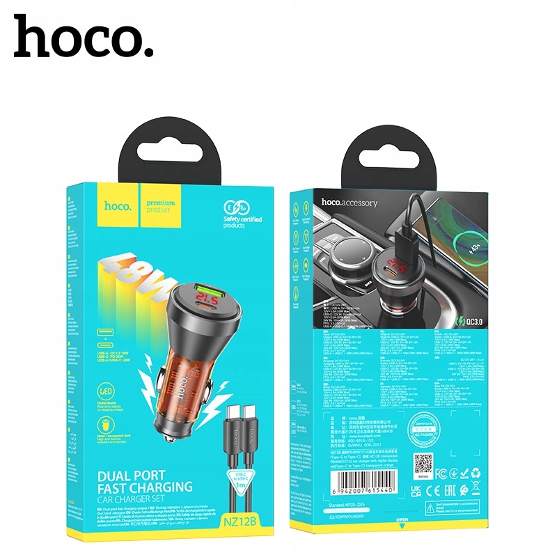 hoco nz12b unimpeded -это быстрое, сильное автомобильное зарядное устройство с двумя выходными разъемами, один из USB-типа / типа C / USB-C / Тип-C с максимальным и вторым стандартом USB-A с максимальной мощностью 18 Вт. Максимальная мощность общего зарядного устройства с использованием как выходных разъемов и зарядки двух устройств одновременно составляет 48 Вт. Зарядное устройство также имеет всю текущую защиту и аттестацию и сертификаты, позволяющие продавать и использовать в Европейском союзе. Длина кабеля, доступная в наборе с зарядным устройством, составляет около 1 м / 100 см. Зарядное устройство имеет светодиодный информационный дисплей, показывающий напряжение батареи типа данных при запуске и во время вождения, а также напряжение и питание при зарядке устройства.