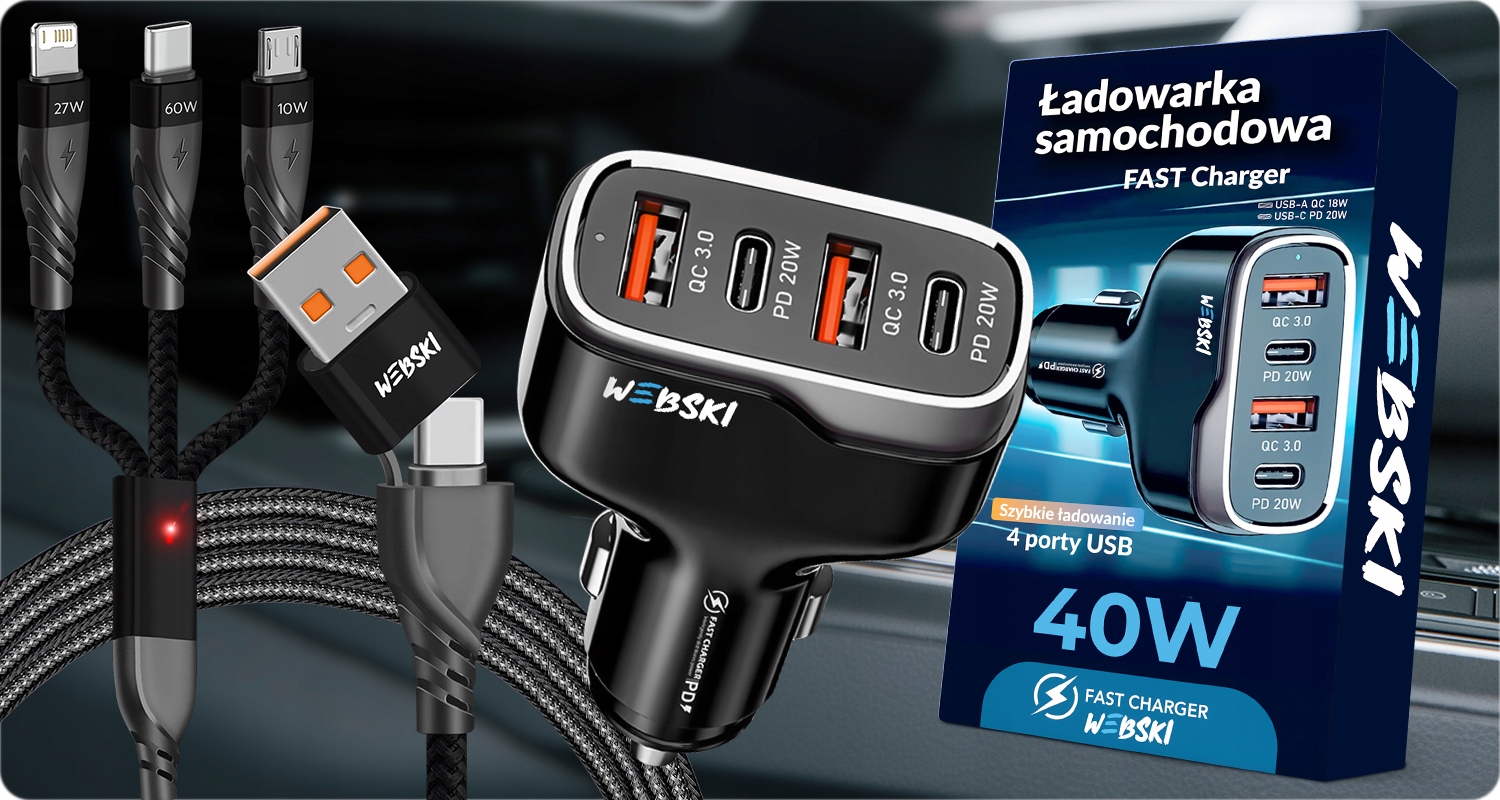 АВТОМОБИЛЬНОЕ ЗАРЯДНОЕ УСТРОЙСТВО WEBSKI 40 Вт — QuickCharge 3.0 / PowerDelivery, небольшое автомобильное зарядное устройство высокой мощности • 2xUSB / 2xUSB Type-C
