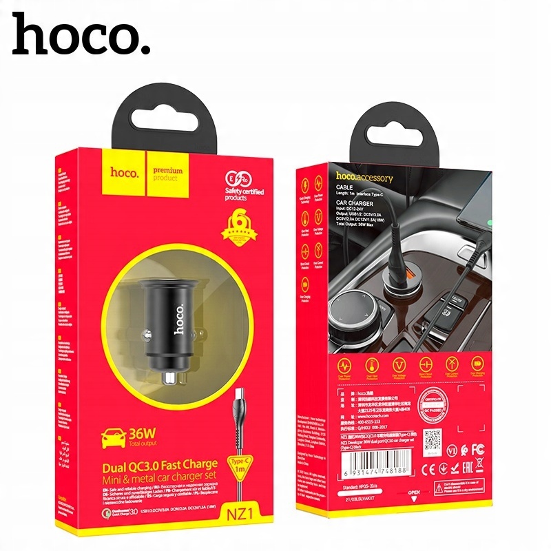 hoco NZ1 Developer — небольшое и короткое металлическое автомобильное зарядное устройство общей мощностью 36 Вт и выходным напряжением на каждом порту 3А максимум, с двумя USB-разъемами, каждый в стандарте Quick Charge 3.0/QC3.0, поддерживающими такую быструю зарядку. стандарты QC3.0/QC2.0/Huawei FCP или Samsung AFC. В комплект дополнительно входит кабель с разъемом USB Type-C/Type C/Type C/USB-C длиной 1 М/100 СМ.