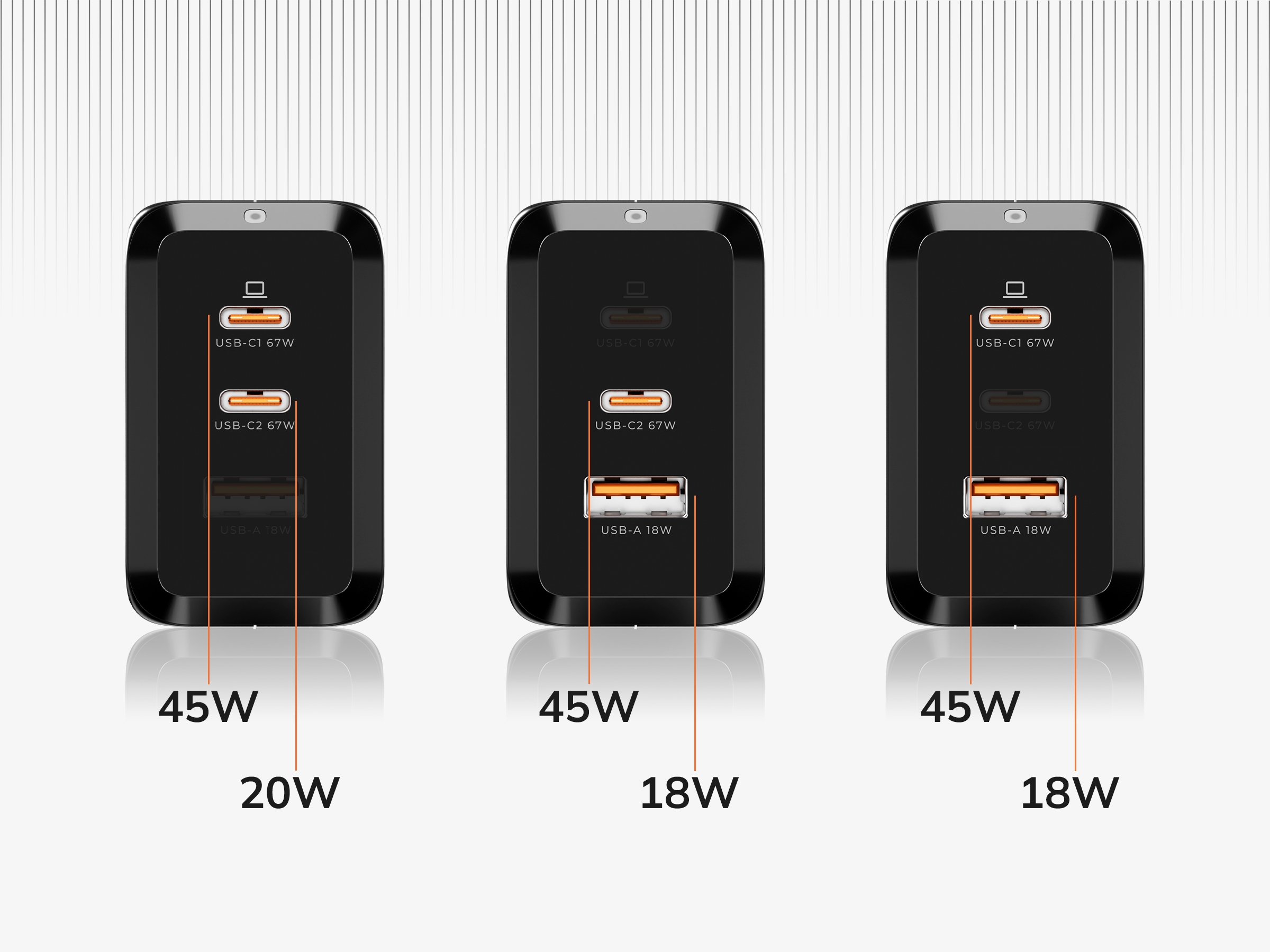 - USB-C1 + USB-C2 + USB-A: Макс. 65 Вт