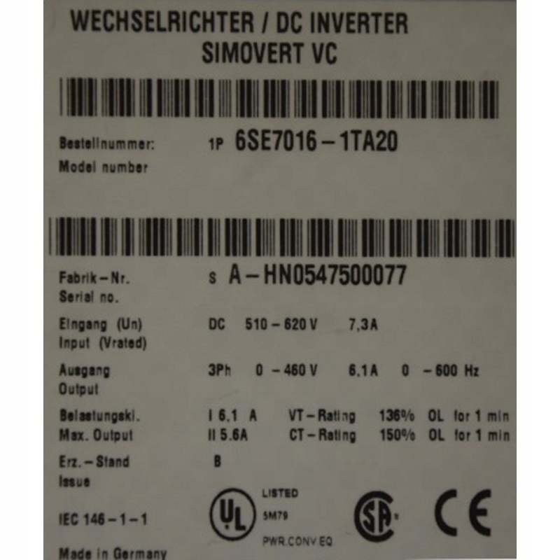 На основе назначенного 6se7016-1ta20 и информации, содержащейся на этикетке, вы можете вывести следующие параметры устройства: