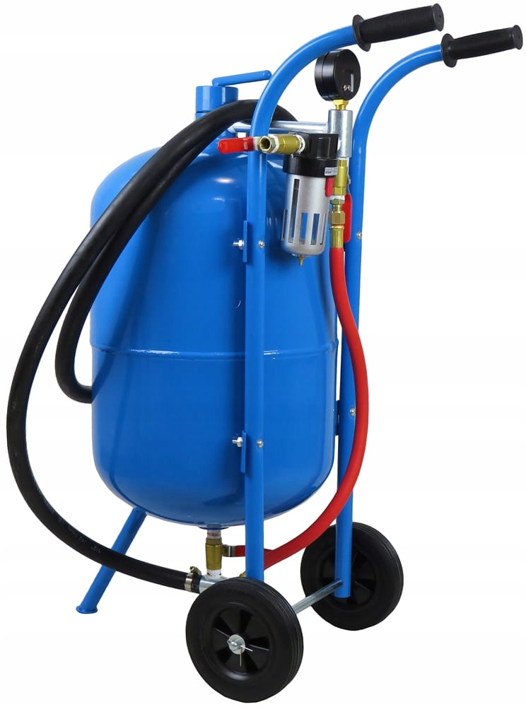 Пескоструйный аппарат оснащен резиновыми колесами и удобными ручками, облегчающими его перемещение и повышающими комфорт оператора.
