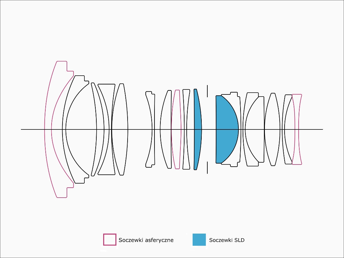 - Конструкция линз: 15 групп, 17 элементов (2 линзы SLD и 3 асферических). объективы)
