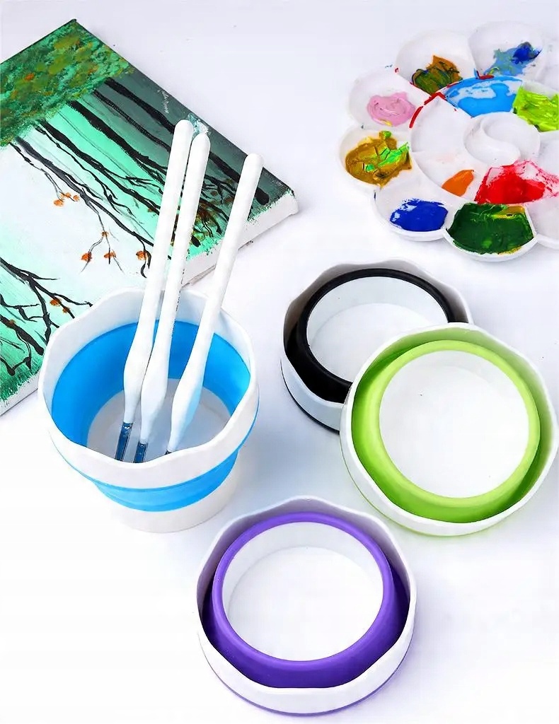 Складывая силиконовая кружка для покраски акварелью, акриловыми красками, плакатами, температурой, гуч или чернилами. В идеале подходит для открытого воздуха, после складывания он имеет высоту всего 3,5 см, так что вы можете легко упаковать его в мешок для перемещения. который имеет характерные линии, благодаря которой легче очистить кисть, потирая по дну. Волновая вершина контейнера является облегчением для сушки щетки, специальные полости на краю кружки не позволяют щетке скользить во время сушки. Только половина, высота 5,7 см p>