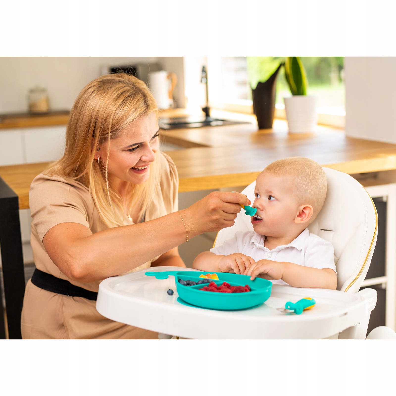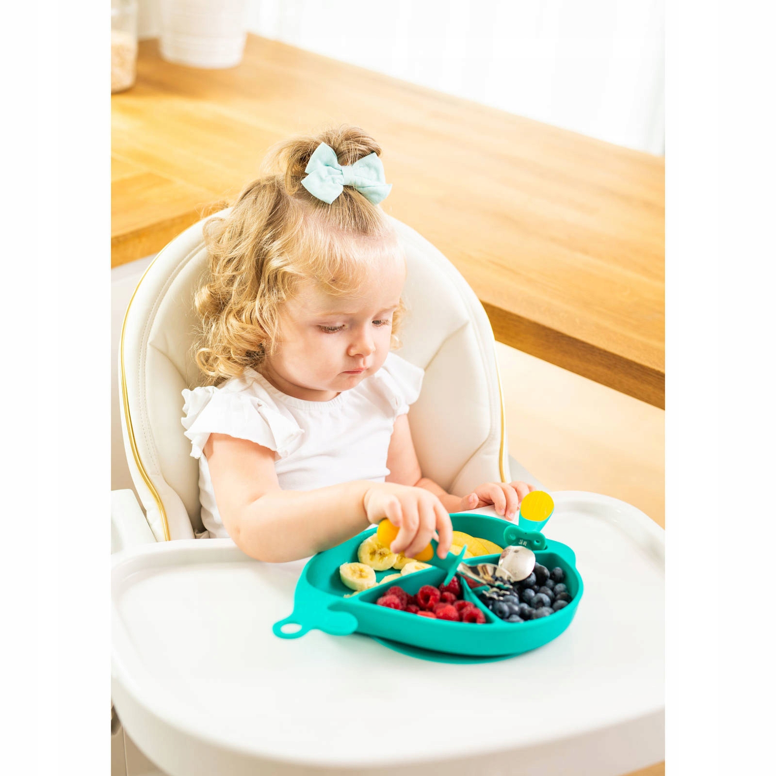 Практичный набор, который сделает трапезу более приятной и побудит детей есть самостоятельно! В него входит силиконовая тарелка в форме кита и набор столовых приборов (вилка и ложка) из нержавеющей стали и силикона. Каждое отделение тарелки имеет разную вместимость, что позволяет соответствующим образом расположить отдельные элементы блюда. В основании тарелки имеется силиконовая присоска, которая предотвращает перемещение тарелки, что облегчает прием пищи малышу.
