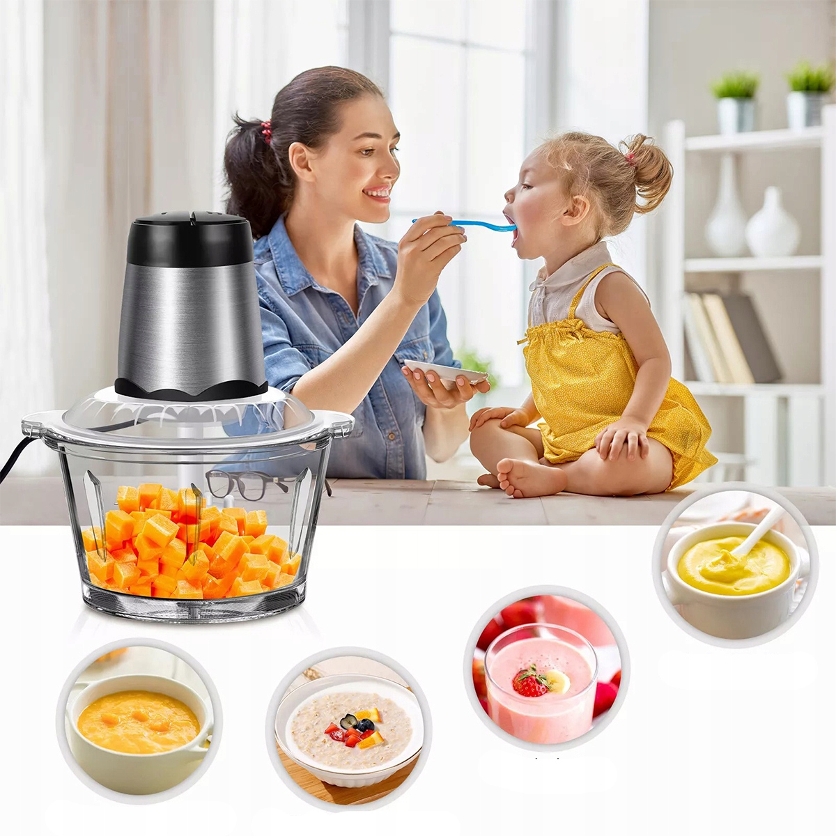 Универсальная стеклянная чаша: использование прочной стеклянной чаши увеличивает функциональность и эстетику кухонного робота. Вместимость 2 L обеспечивает много места для обработки ингредиентов, а прозрачная конструкция позволяет отслеживать прогресс на рубеже. Его универсальность выходит за рамки резки, потому что ее также можно использовать для подачи и хранения приготовленных ингредиентов.