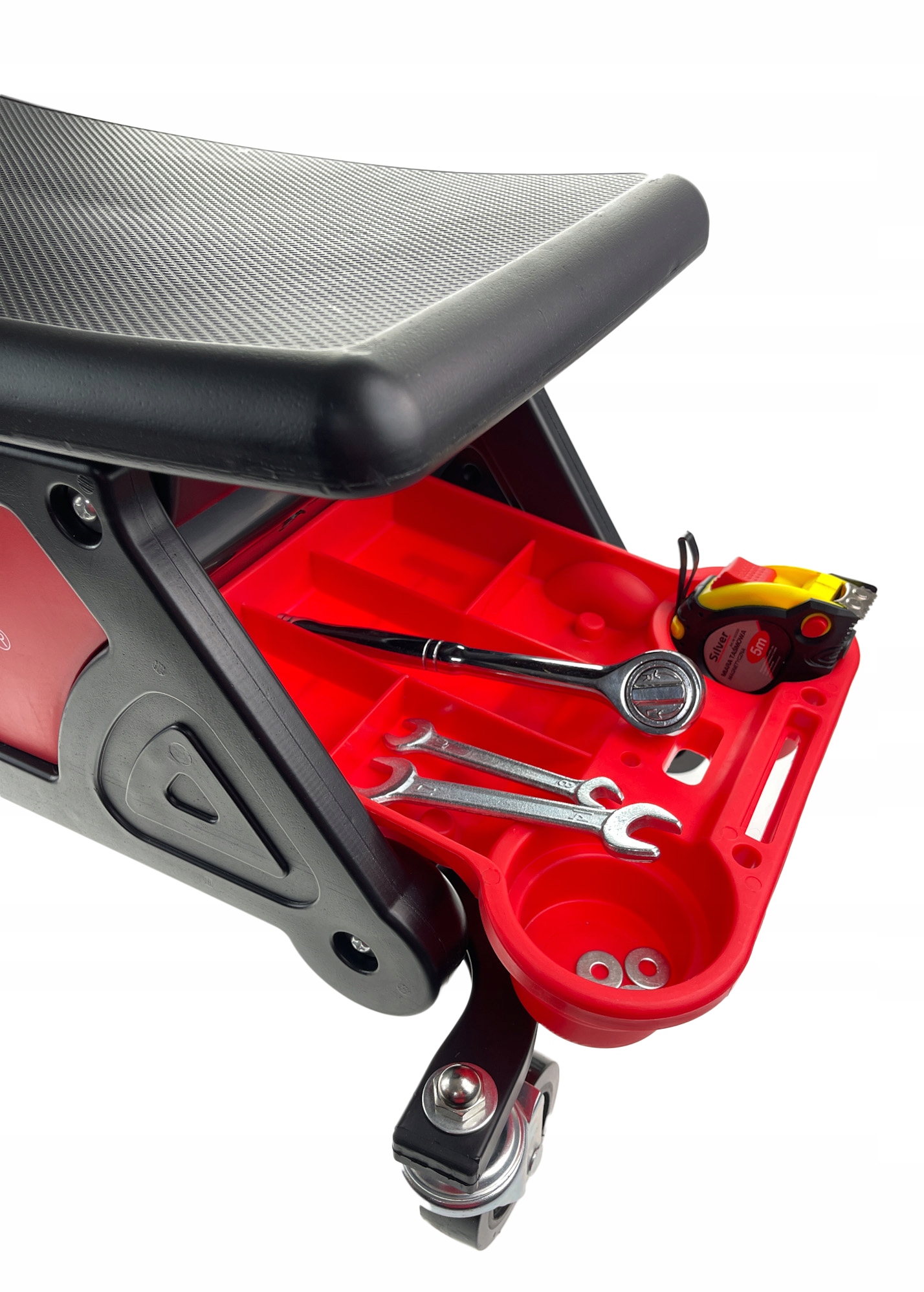 Верстак с сиденьем-табуретом, поворачивающимся на 360°, выдерживает нагрузку до 135 кг и оснащен четырьмя поворотными роликами на 360°, в том числе двумя с тормозами. Ящик и отсеки для хранения вещей съемные, сиденье нескользящее. Табурет доступен в черном или красном цвете и изготовлен из полиэтилена высокой плотности и металла. Его размеры 37х37,5х68 см (ширина х высота х длина).