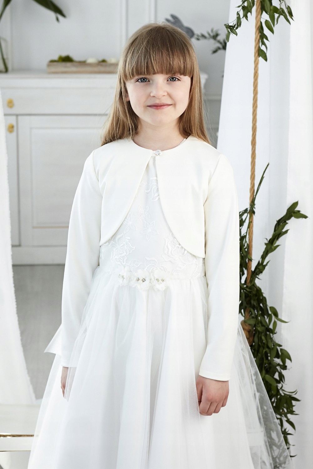 Болеро из плотной ткани пунто идеально подойдет к платью или блузке. Доступен в двух цветах: белом (оптически белом) и кремовом. Застегивается на пуговицу спереди. Более короткий крой не закрывает платье. Идеально подходит для холодных дней.