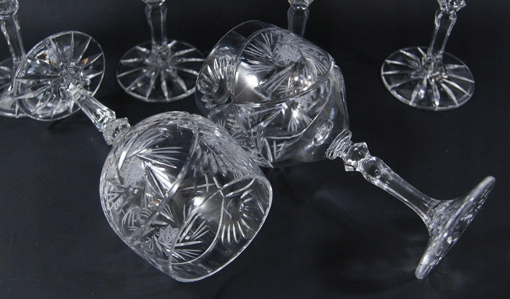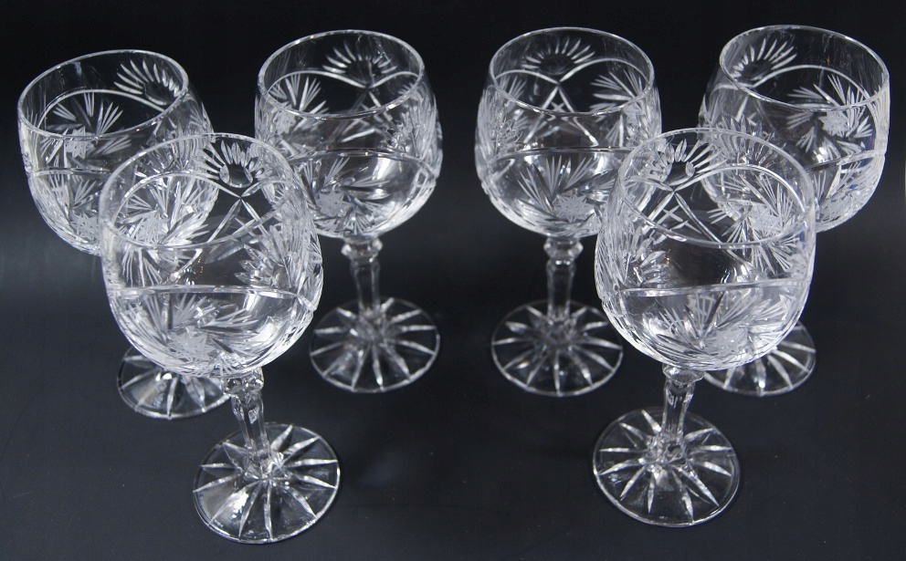 Красивый набор из 6 стаканов, изготовленных из бесцветного хрустального стекла, узор, украшенный срезами. Старые очки, есть слабые пузырьки воздуха.