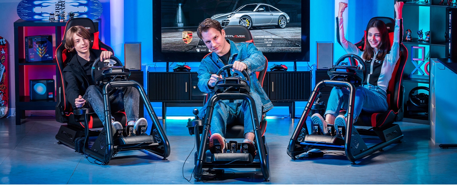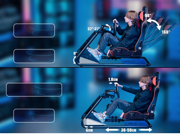 Стенд рулевого управления gtplayer имеет регулируемую высоту, наклон и положение, обеспечивая удобный и гибкий опыт. Интегрированные динамики предлагают эффект привыкания 3D, совместимый со всем рулевым колесом, педалями и переключателями передач. Кожаное сиденье высокого качества устойчиво к морщинах, с максимальной грузоподъемностью 400 фунтов, обеспечивая безопасность.