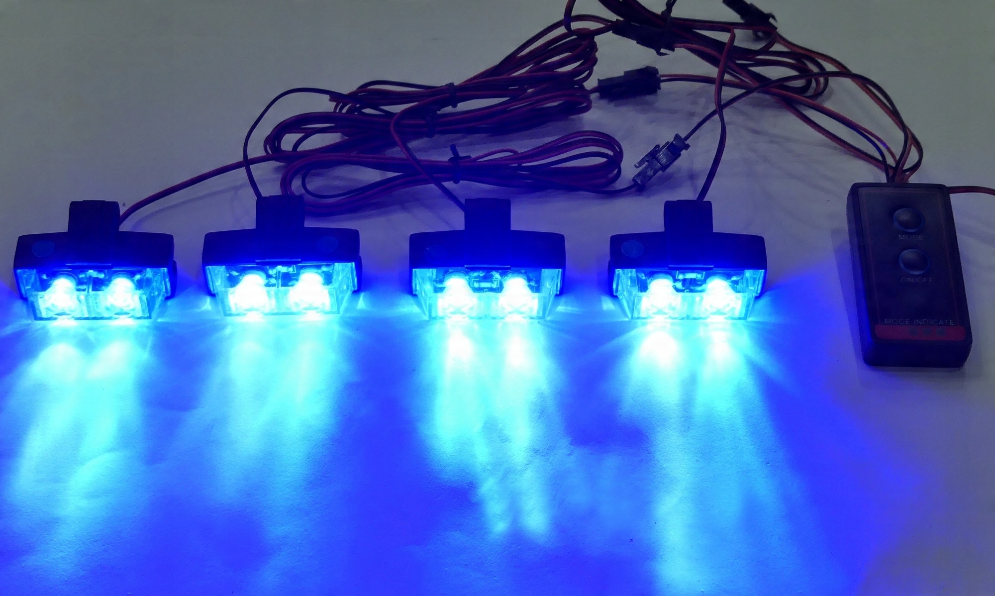 Комплект состоит из блока управления, модуля управления и 4 светодиодных ламп. Ниже ссылка на видео, показывающее работу стробоскопов (белая версия)
