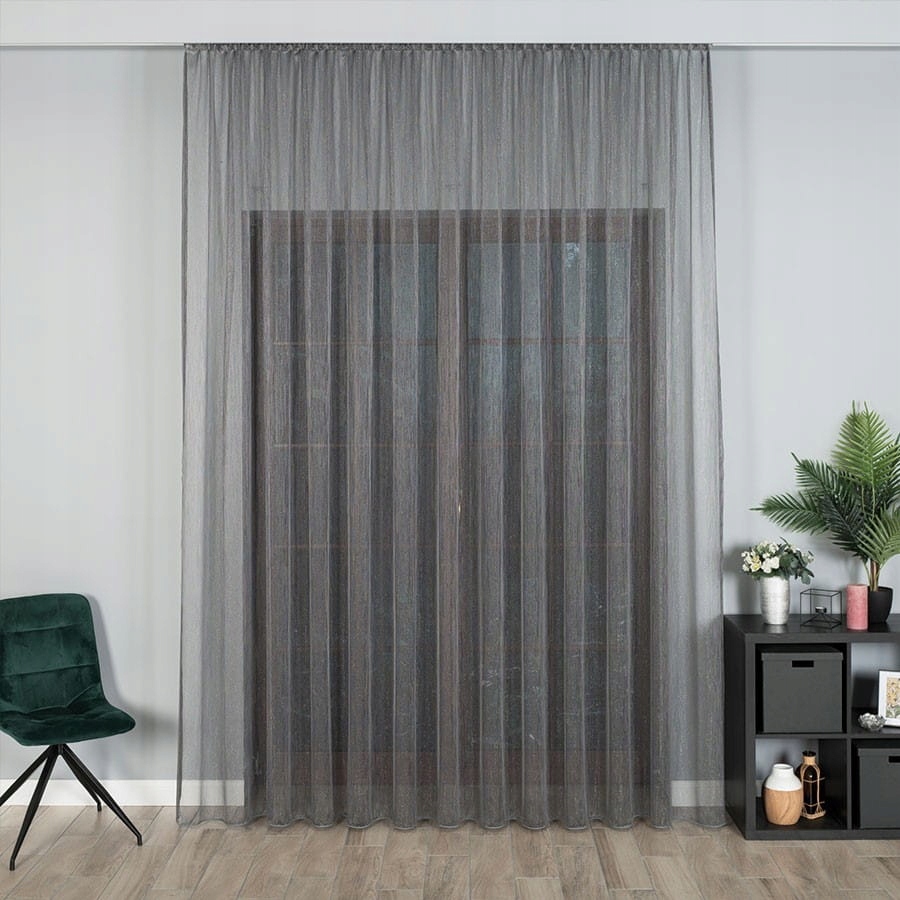 Современная серая штора из тонкой сетки, декорированной серебристой блестящей нитью. Внизу отделка свинцом, благодаря чему занавеска прекрасно драпируется.