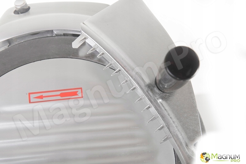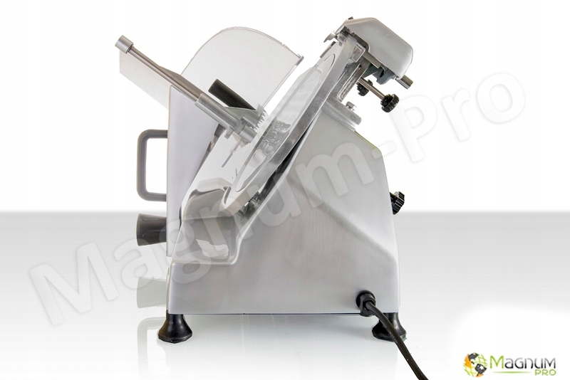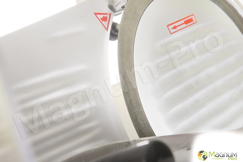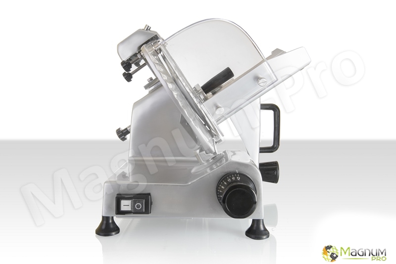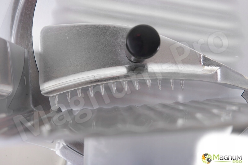 Слайсер оснащен твердохромированным ножом диаметром 22 см с вогнутой заточкой и гладким лезвием. Нож имеет бесступенчатую регулировку расстояния, что обеспечивает толщину нарезки от 0 до 12 мм.