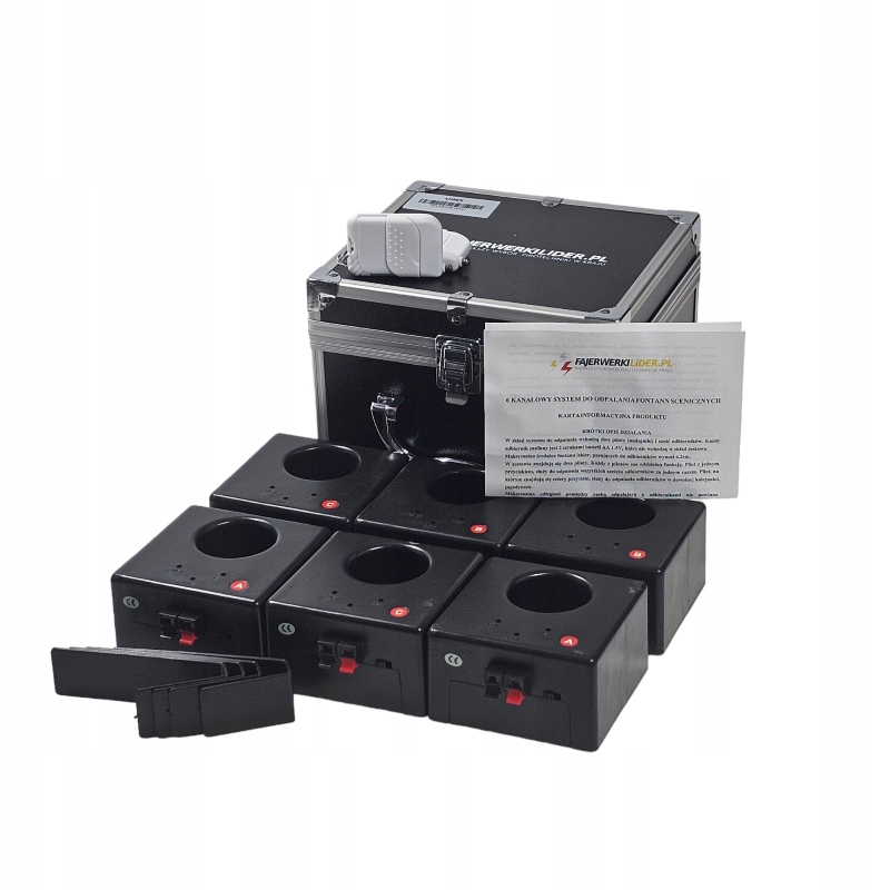 Система запуска состоит из двух пультов дистанционного управления (передатчиков) и шести приемников. Каждый приемник питается от 2 батареек типа АА 1,5 В (не входят в комплект). Первый пульт, оснащенный одной кнопкой, используется для одновременной активации всех шести приемников. Второй пульт имеет четыре кнопки и позволяет включать приёмники в любом порядке, по одному. Пульты дистанционного управления питаются от батарейки MN21 (не входит в комплект).Максимальный диаметр фонтана составляет 42 мм (4,2 см), поэтому система подходит для большинства сценических искр, доступных в Европе. Соединение ресивера с подставкой для фонтана – это не только отличное эстетическое решение, но и влияет на безопасность труда. Это позволяет избежать падения фонтанов искр во время зажигания и позволяет укоротить кабели зажигания до минимальной длины. Сертифицированный комплект. В каждый комплект входит информационная карточка продукта и руководство пользователя.