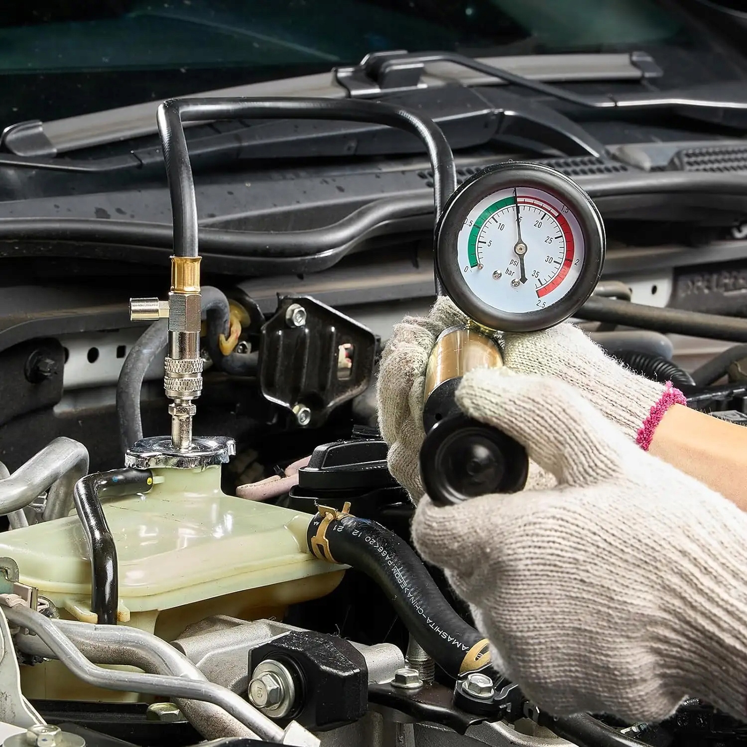 Устройство для обнаружения утечек в резервуаре для воды простое. Обнаружение утечки обычно занимает около 10 минут. Просто выберите крышку радиатора и положите ее на отверстие, а затем запустите ручной насос, пока давление не достигнет 10-15 фунтов на квадратный дюйм (примечание: не более 35 фунтов на квадратный дюйм). Затем обратите внимание на давление датчика давления. Если чтение автоматически падает, это означает утечку в радиаторе. Проверьте и ремонтируйте систему радиатора, если это необходимо.