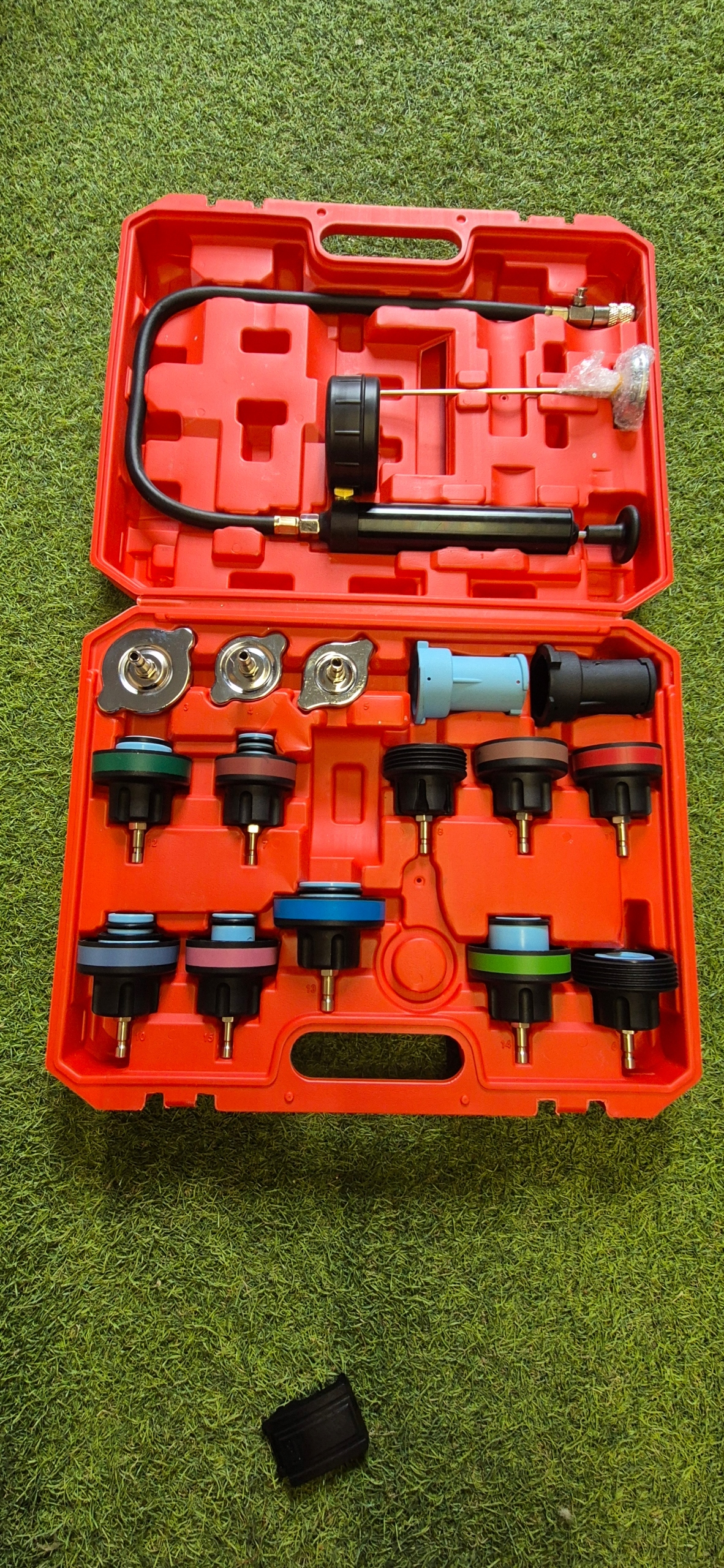 - Устройство для управления и заполнения систем охлаждения, оно подходит всем обычно используемым типам транспортных средств. Адаптер на радиаторе или расширительном резервуаре и позволяет проверить плотность из -за гипертонии в системе, поэтому в случае потери давления вы можете найти утечки, используя визуальный контроль.