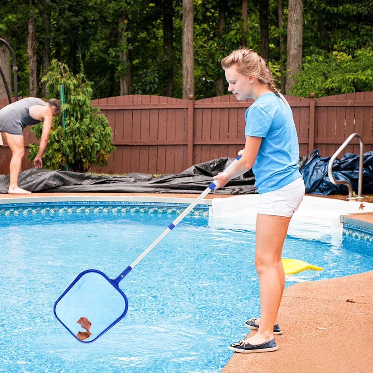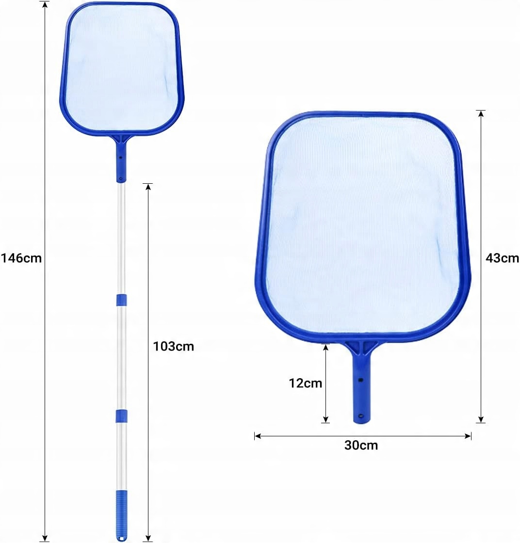 - Сетки бассейна с алюминиевыми телескопическими стержнями- это сетка с тонкими сетками, которые фильтровали наименьшие частицы с поверхности воды.