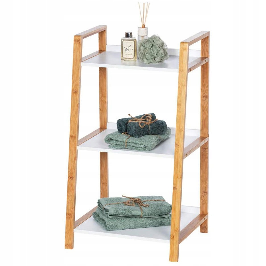 И здесь нам на помощь придет полка для ванной комнаты WENKO – она прекрасно впишется даже в маленькое или неудачно спроектированное пространство ванной комнаты. Он не занимает много места, а на его полках можно хранить огромное количество вещей. Она выполнена в нейтральном бамбуковом цвете с белыми полками.