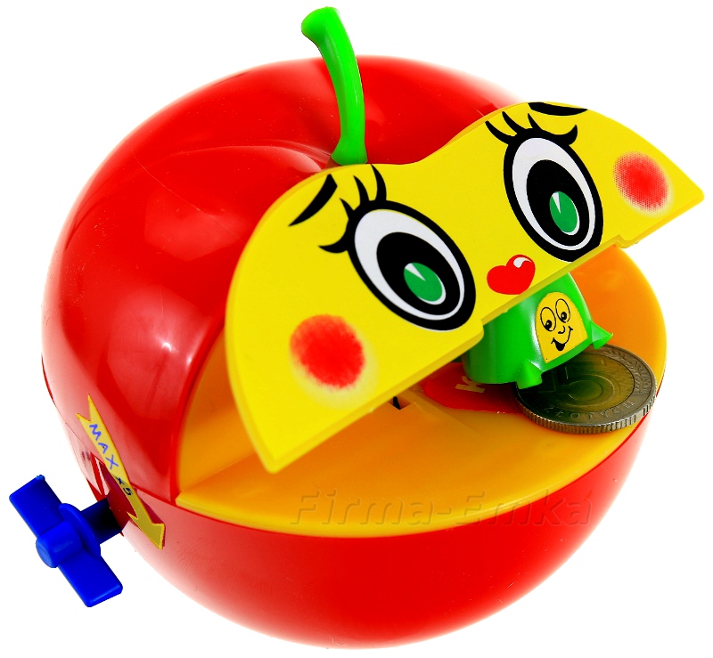 Копилка с автоматическим сбором монет - просто поместите монету в место с надписью CASH и слегка нажмите, и из яблока вылезет веселый улыбающийся червячок и поднесет монету к яблоку.