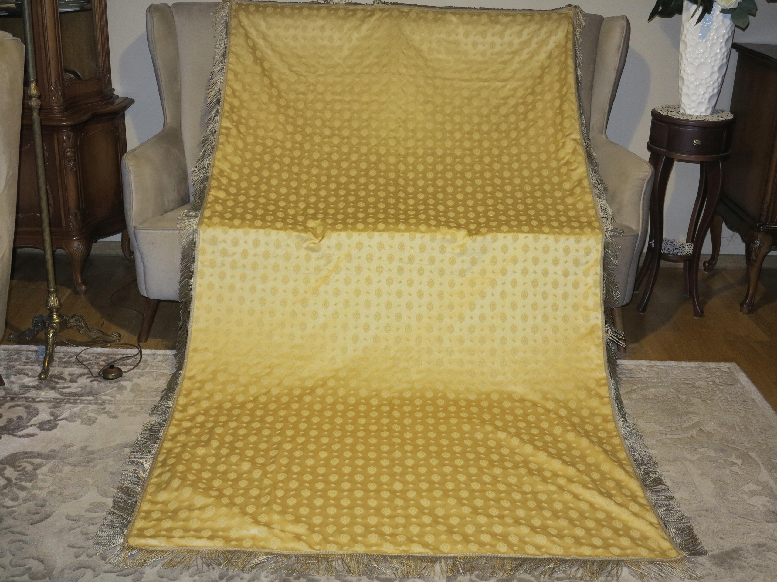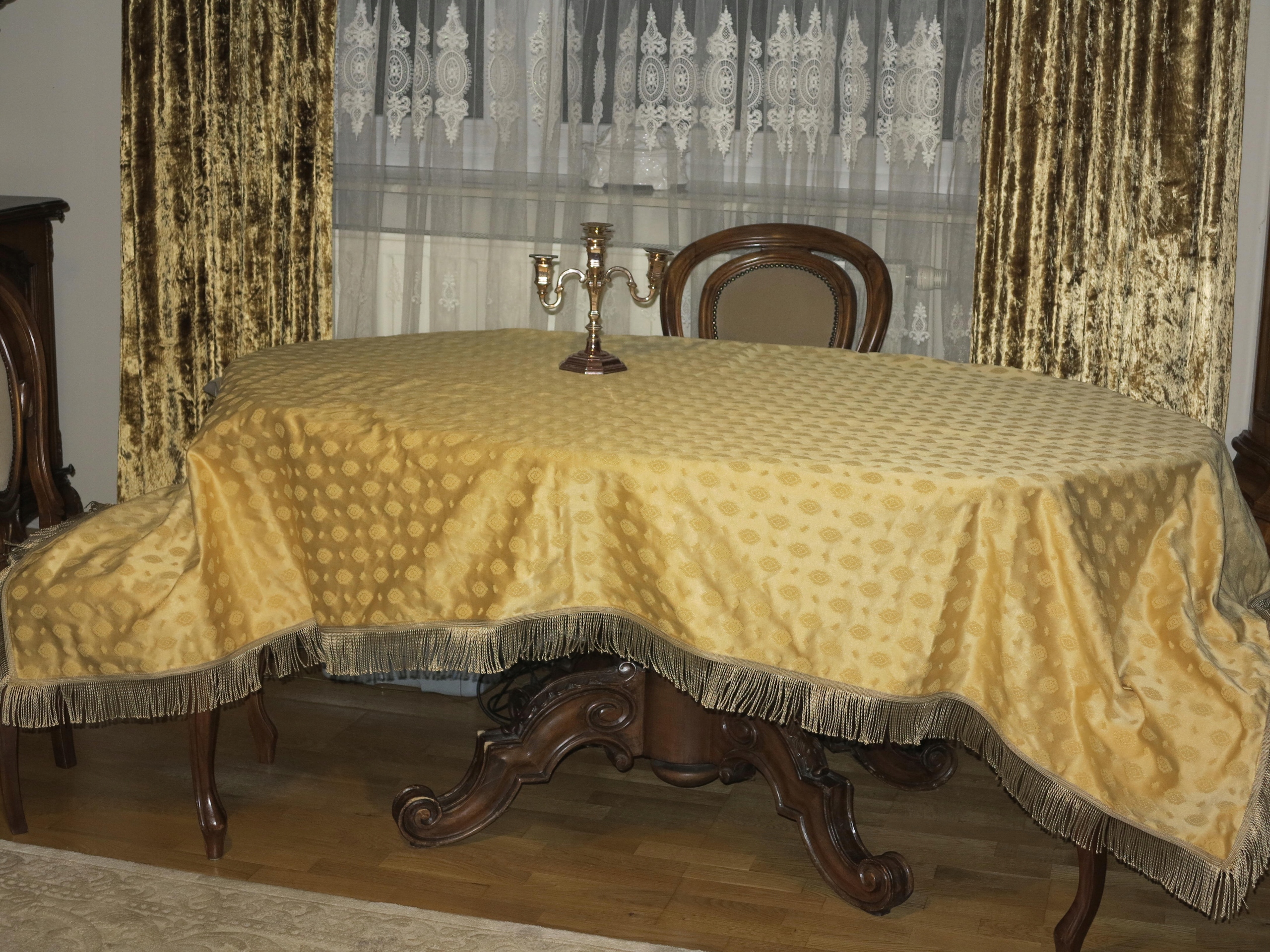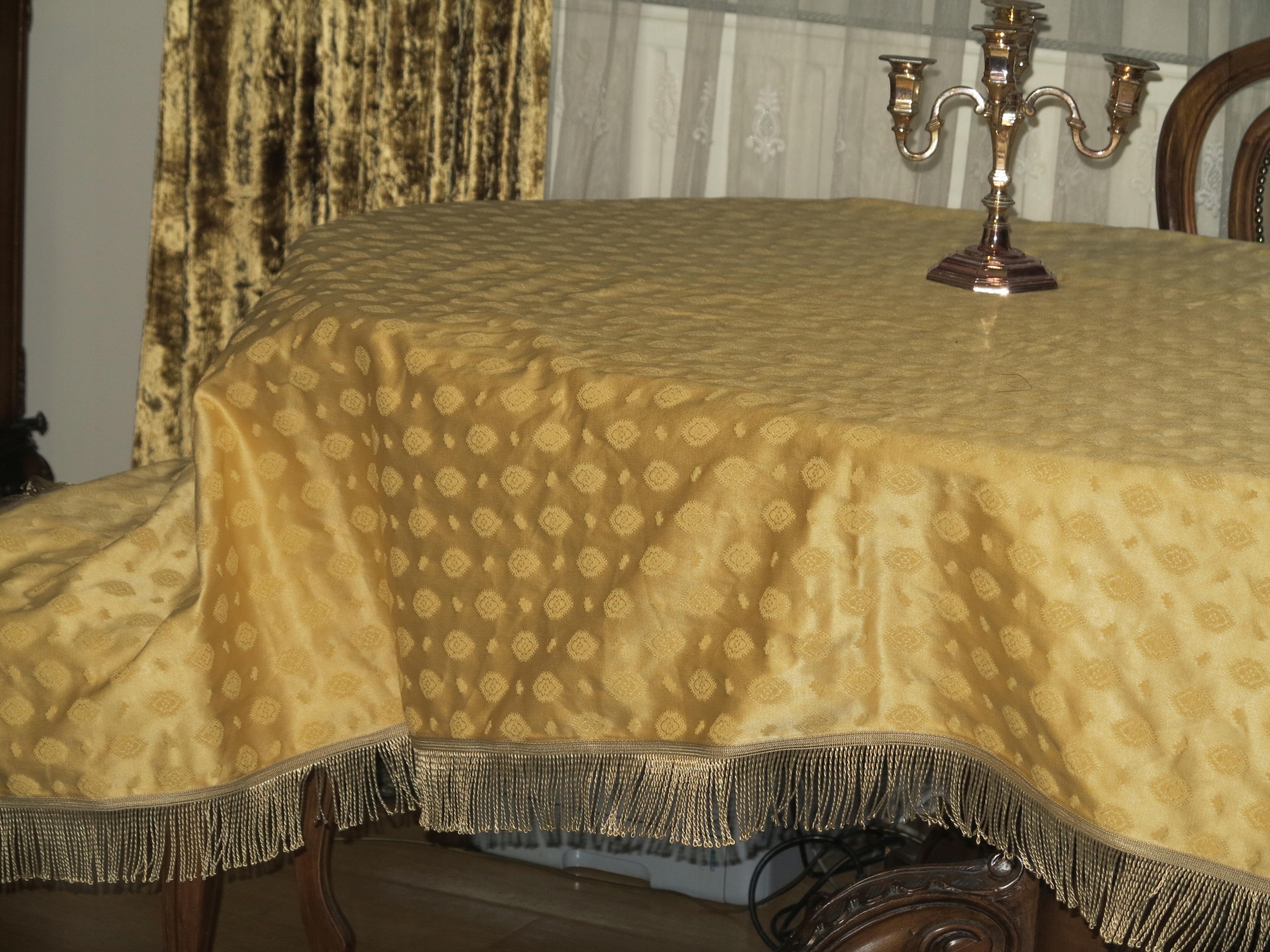 Предмет аукциона – красивая стильная золотая скатерть с небольшими стильными узорами и золотой бахромой по периметру. Размеры скатерти: 237/132 см плюс бахрома примерно 7 см. Скатерть б/у, в очень хорошем состоянии. Рекомендую