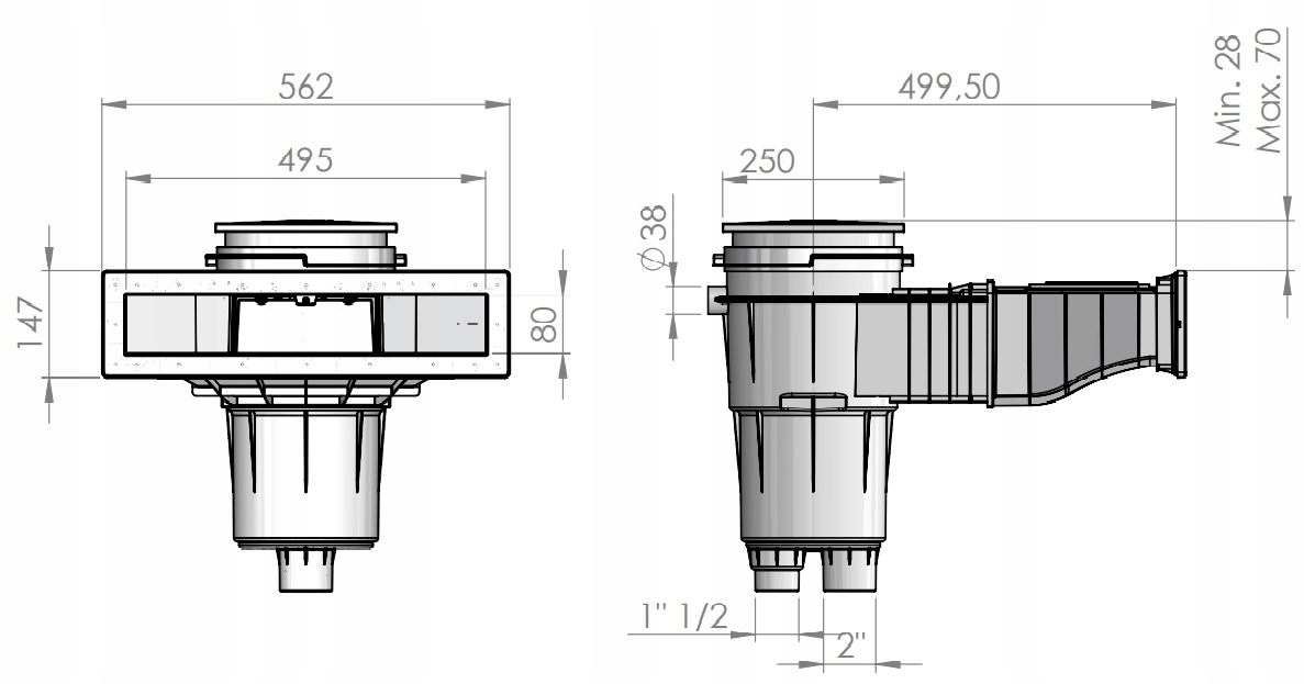 Скиммер 17,5 л подходит для установки в публичных и частных бассейнах. Изготовлен из белого пресса с защитой от ультрафиолета, оснащенным лоскутом, регулятором потока, регулятором высоты крышки и ловцом листьев. Входной вход имеет размеры 495 х 80 мм. Рекомендуемая скорость потока 7,5 м³/ч.