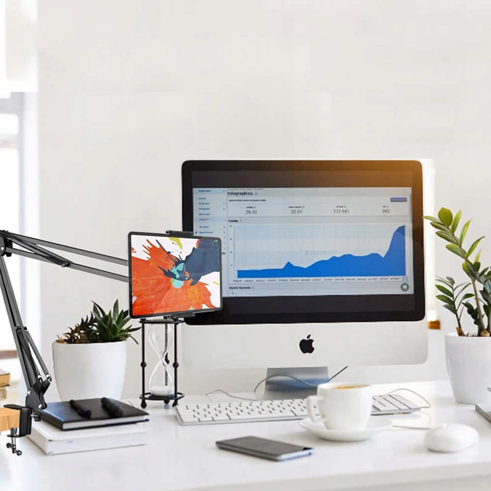 Вращение с 360 градусами и регулировка с помощью ручки с зажимом для поворота на 360, чтобы легко схватить устройство и адаптироваться к наиболее удобному углу обзора, снижая давление на шею и руки, удерживая устройство в течение долгого времени; Движущаяся рука идеально подходит при просмотре фильмов и слушает музыку на кровати или диване