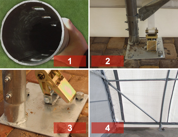 В наших залах мы используем очень большие четырехгранные ножки с увеличенной точкой опоры. Они обеспечивают прочное крепление палатки к любому типу грунта. Нет необходимости устанавливать фундаменты.