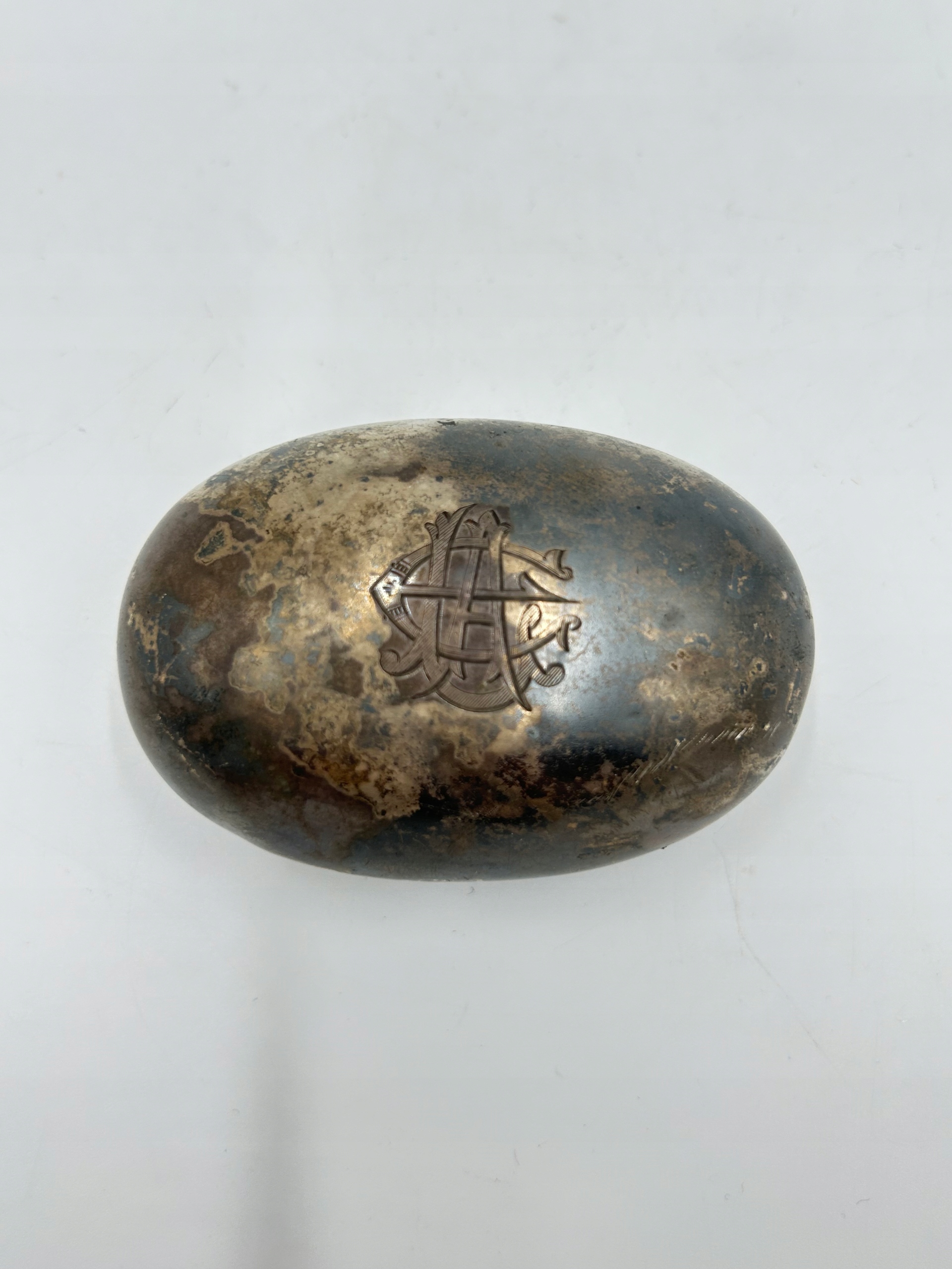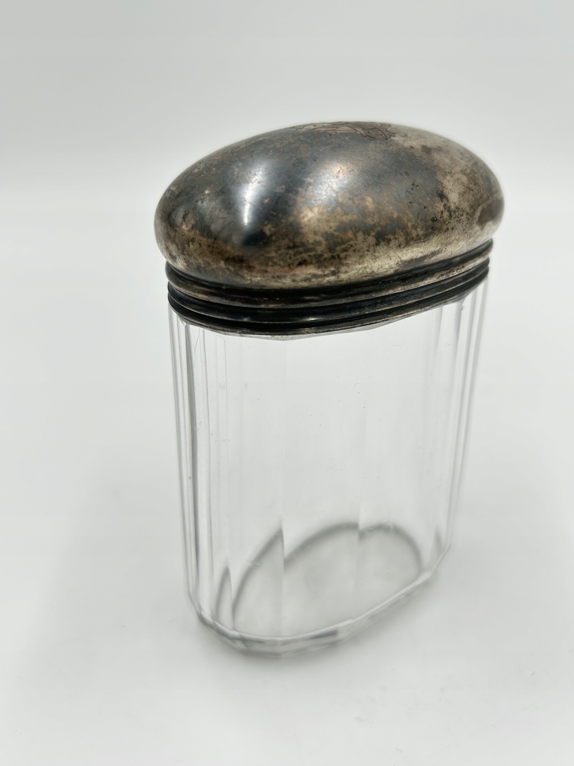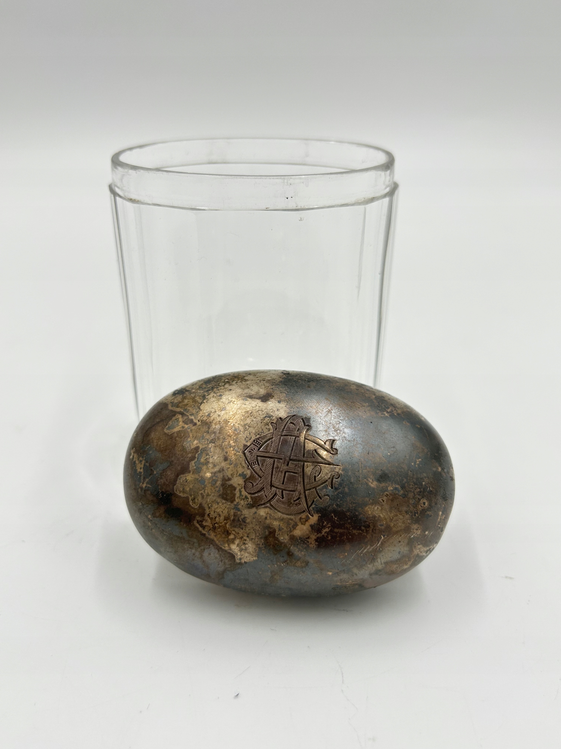 Я представляю вам элегантный стеклянный контейнер с серебряным орехом (925), украшенный монограммой. Уникальный декоративный элемент для людей, которые ценят вневременную элегантность. Англия, Лондон 1890