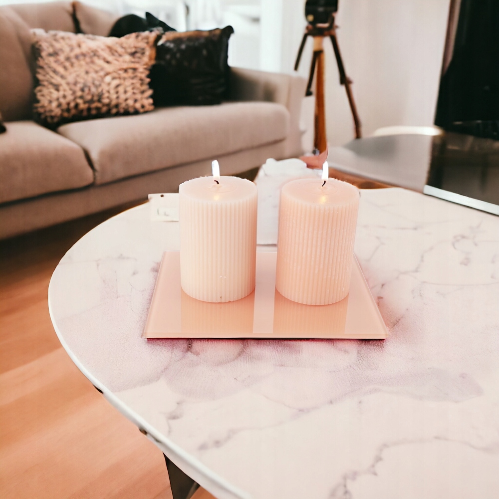 Подставка для свечей изготовлена из лакированного стекла 4 мм. Стекло находится в персике, лососе и абрикосе. Стенд приклеил войлочные ноги. Мы сами разрезали стекло и полируют в нашей мастерской.
