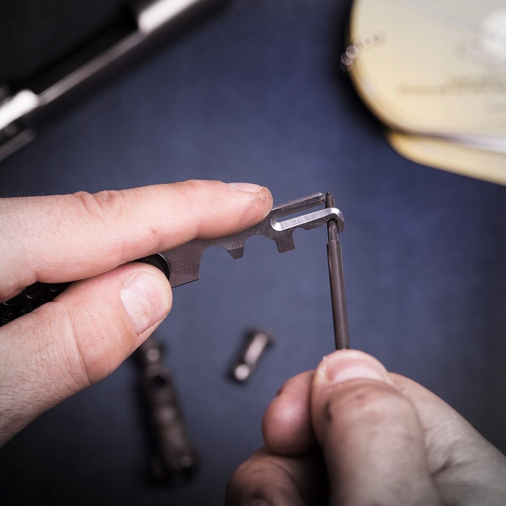 Скребок изготовлен из незакаленной нержавеющей стали, поэтому с его помощью можно легко удалить грязь, не повреждая компоненты оружия, изготовленные из более твердой стали. Поворотная прессованная крышка также служит удобным захватом.