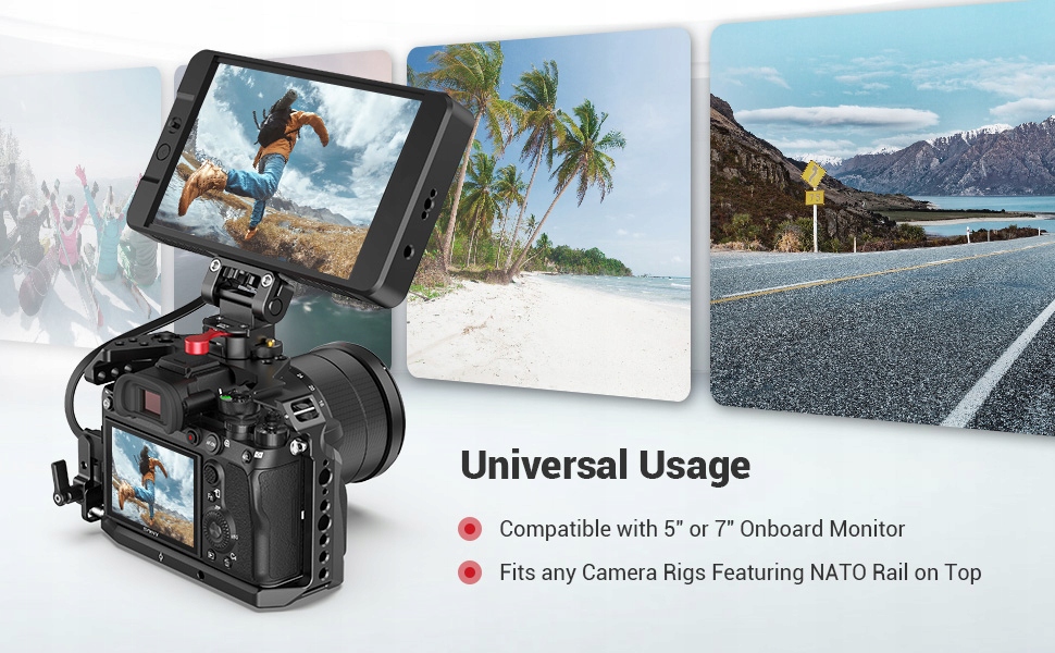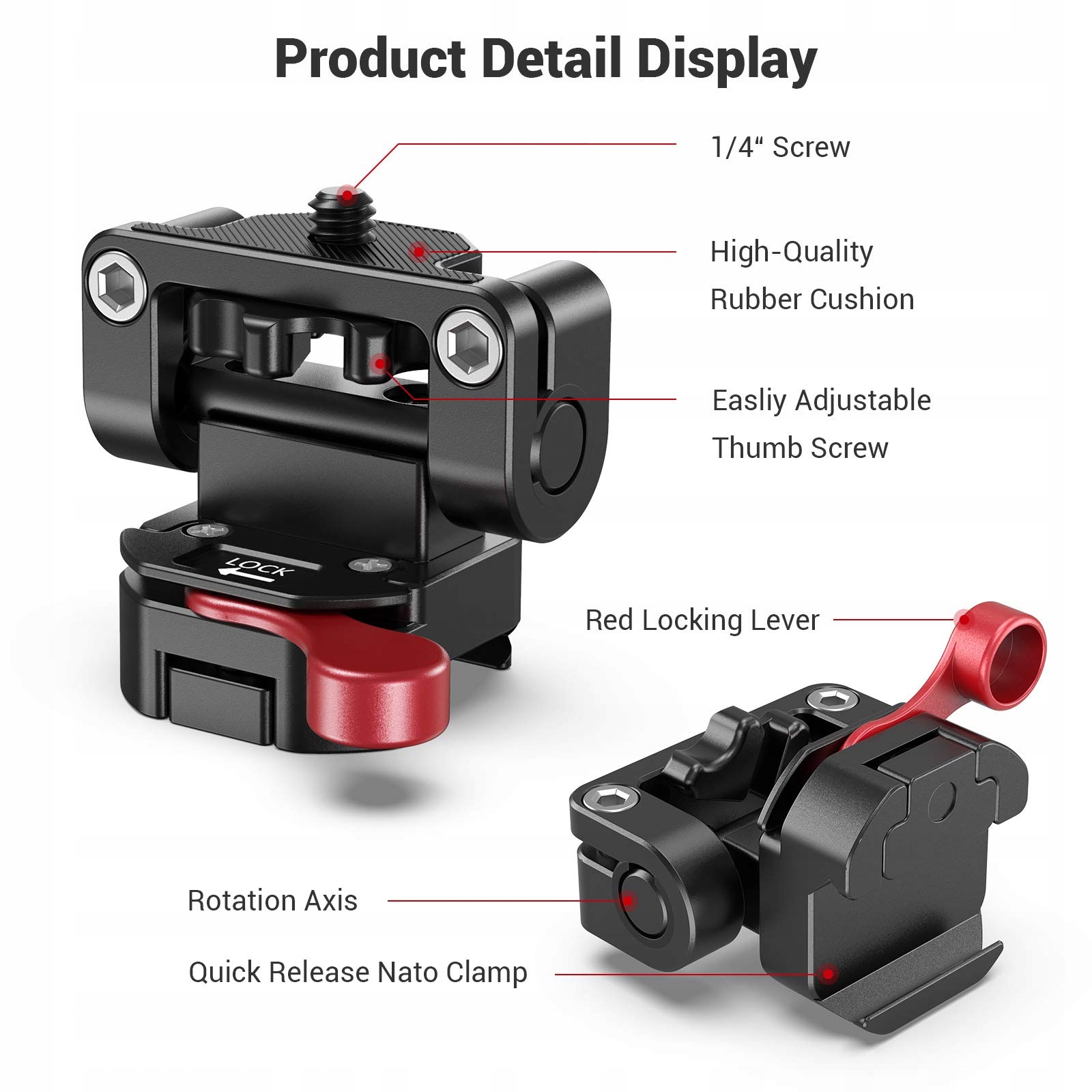 SmallRig 2100 Monitor Holder NATO Clamp — крепление для монитора, электронного видоискателя или записывающего устройства с плавной регулировкой наклона и удобным 1/4 ". Винт. Вы можете быстро и безопасно закрепить держатель на каркасе камеры или элементах крепления, используя быстроразъемный соединитель для рейки NATO.