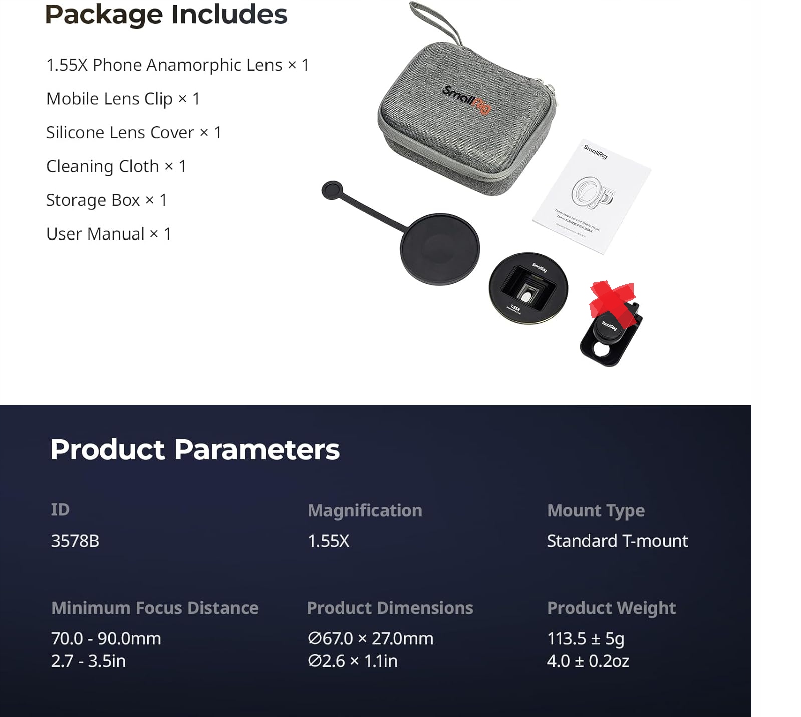 - 【Рекомендации для приложений, которые следует использовать】 Анаморфическая линза 1,55x 3578b должна использоваться с приложением. Он совместим со многими приложениями, такими как Blackmagic CAM (не требует оплаты), Speedorgear (не требует оплаты) и Video Pro (заявка на оплату).