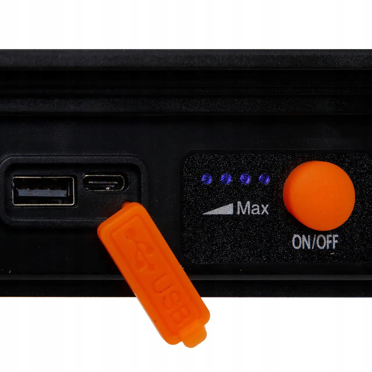 - Многофункциональная светодиодная лампа имеет 4 светодиода, сигнализирующих об уровне заряда аккумулятора, что позволяет легко контролировать состояние аккумулятора. Он также оснащен USB-входом для подключения зарядных устройств и портом USB-C для зарядки самой лампы. Благодаря этому использование светильника исключительно комфортно и универсально, обеспечивая доступ к свету и энергии в любой ситуации, USB-порты защищены пломбой