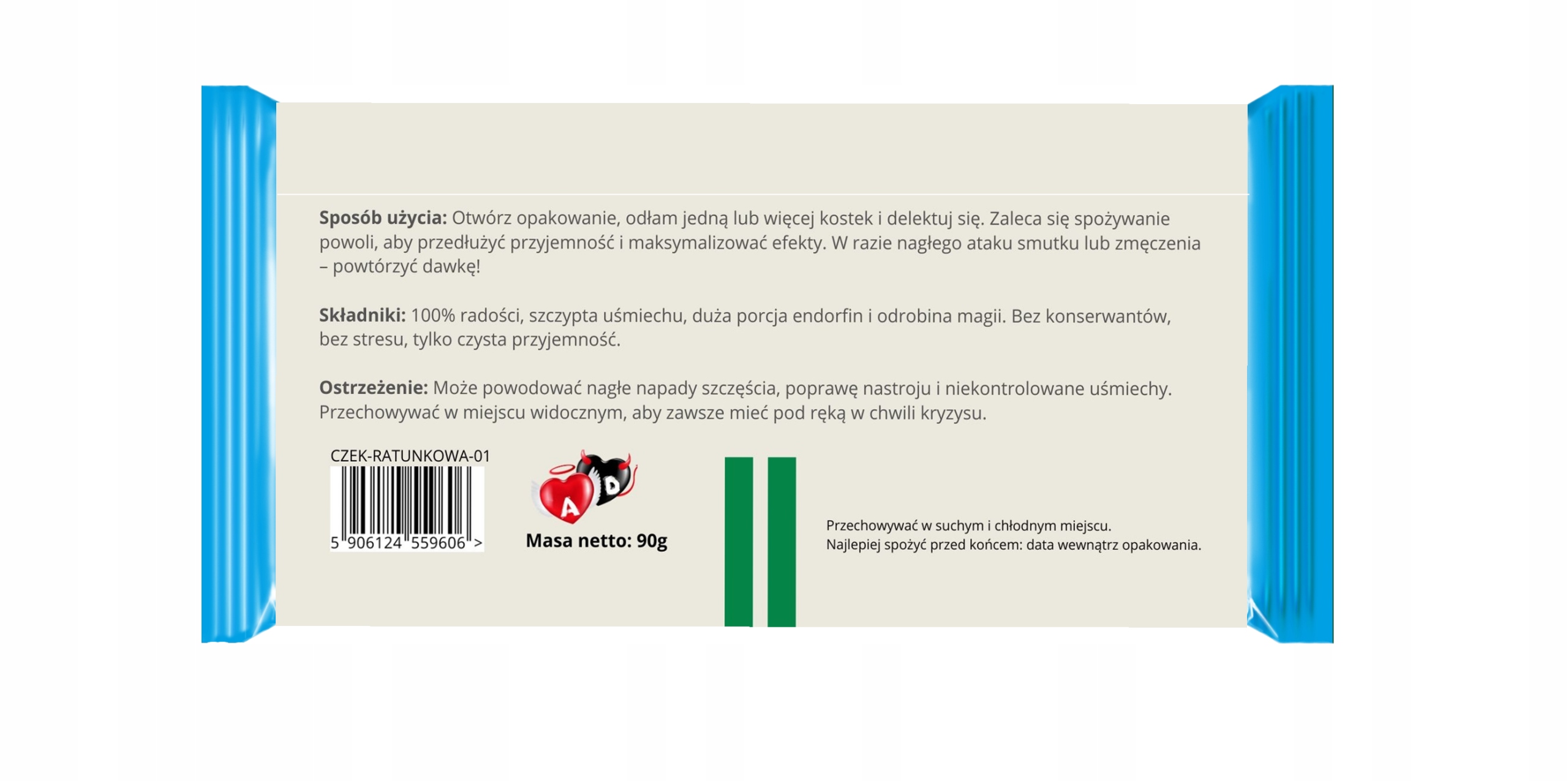 - Надпись: «Аварийный шоколад, немедленное облегчение. Улучшение юмора Гарантированное! Противоядие от грусти. Прекращение для внезапной потребности в радости - 100% эффективность. Аварийная доза счастья»