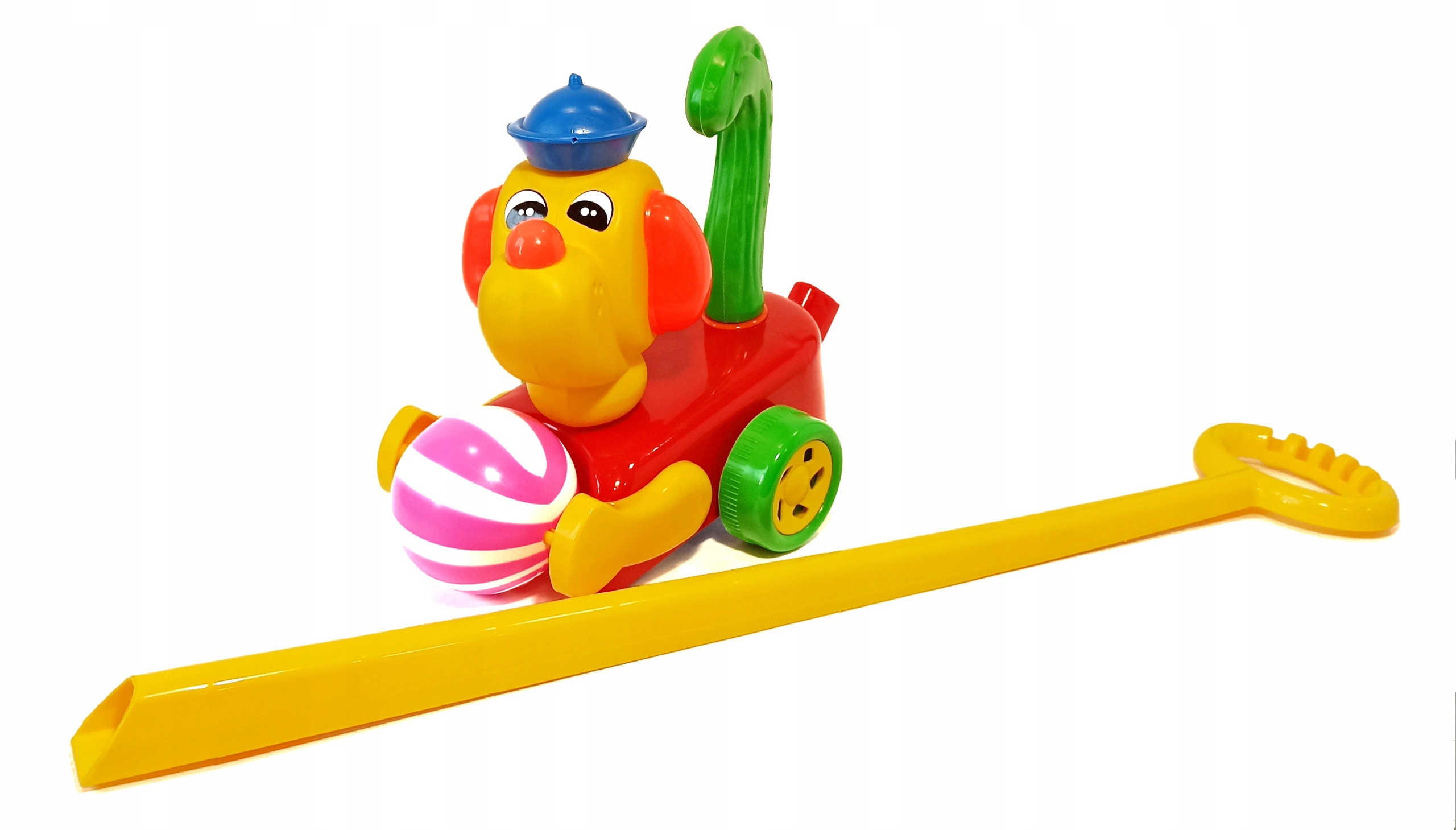 Ребенок толкает игрушку. перед собой с помощью прилагаемой палочки.