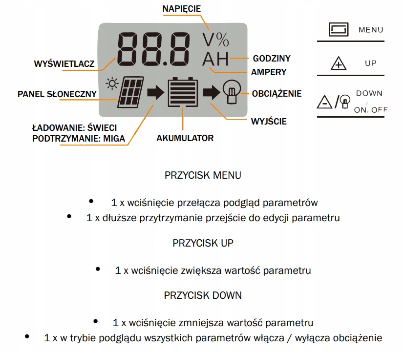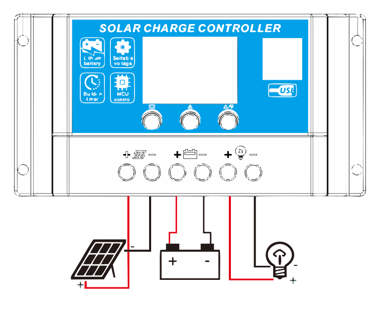 - Перегрузка, короткое замыкание, повышенное напряжение, пониженное напряжение защита от перезаряда/разряда аккумулятора, от обратной полярности