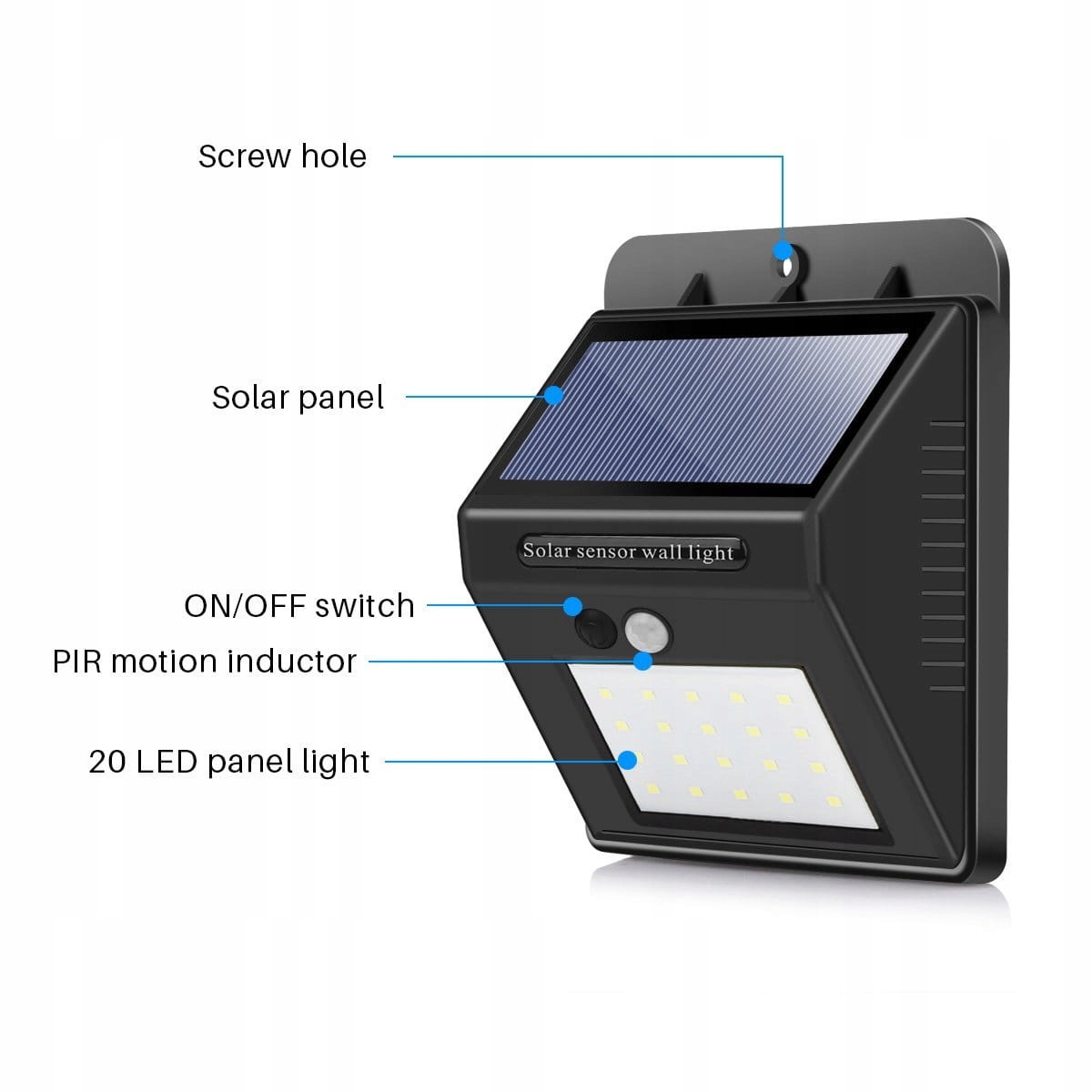 Солнечная лампа 20 светодиодов с датчиком освещенности и чувствительным датчиком движения в качестве дополнительного освещения.