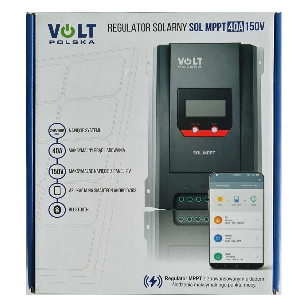 предназначен для зарядки батарей из подключенного солнечного панели. Это современное и многофункциональное устройство реализует зарядку на основе новейшей и наиболее эффективной технологии зарядки MPPT. Он контролируется зарядкой и эксплуатацией солнечных панелей с использованием ЖК -дисплея, встроенного в устройство, и приложение Solarlif Солнечная жизнь в Google Play Store для Android