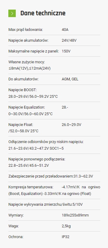 - Temperature sensor with automatic temperature compensation (if the temperature exceeds the set value, the charging current will decrease in order to break the temperature)