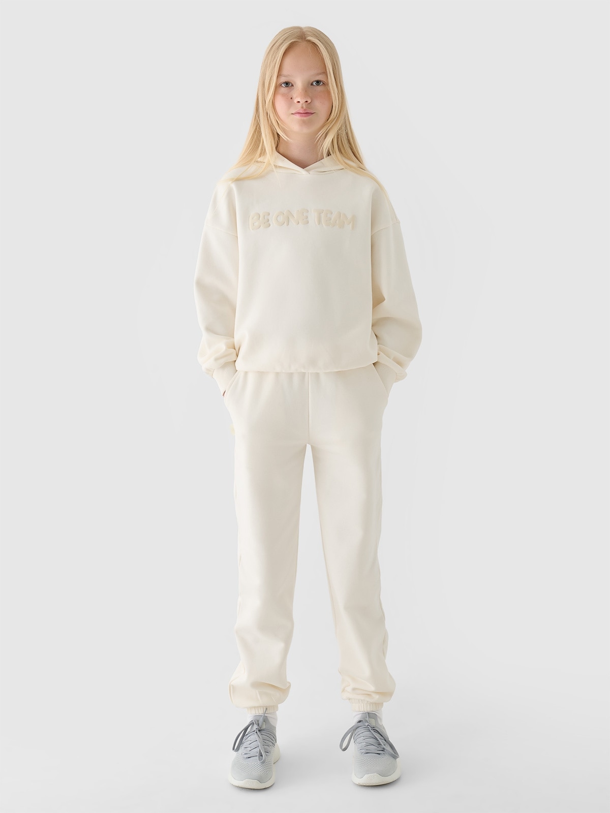 < Спортивные костюмы для девочек p>4F изготовлены из 77% хлопка, что делает их мягкими, прочными и приятными на ощупь. Добавление полиэстера (23%) позволяет материалу сохранять форму и быть устойчивым к износу даже в течение многих сезонов.Начесовая внутренняя часть гарантирует дополнительное тепло, что делает брюки идеальным выбором для холодных дней. По бокам 2 открытых кармана. Эластичный пояс без регулировки.