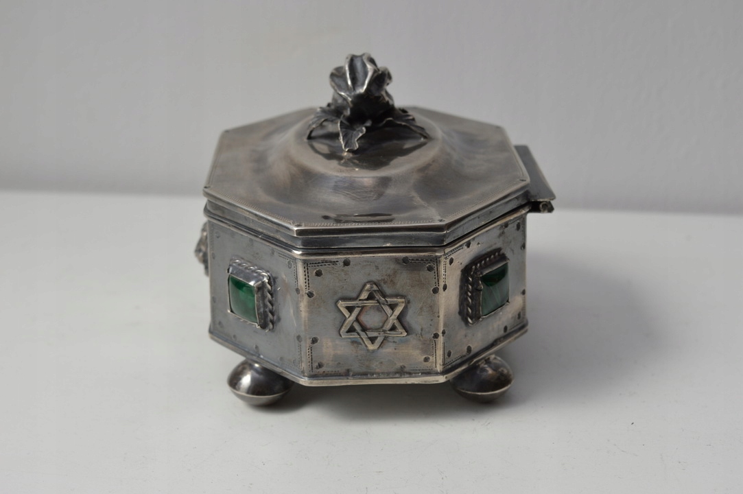 A красивая сахарница коробчатого типа XIX века, поддерживаемая на четырех ножках профилированной крышкой, закрепленной на шарнире. Крышку сахарницы увенчивает лимон - тоже из серебра. Серебро чрезвычайно богато гравировано, внутренняя часть полирована позолотой. По бокам сахарницы имеются многочисленные иудейские украшения и драгоценные камни.