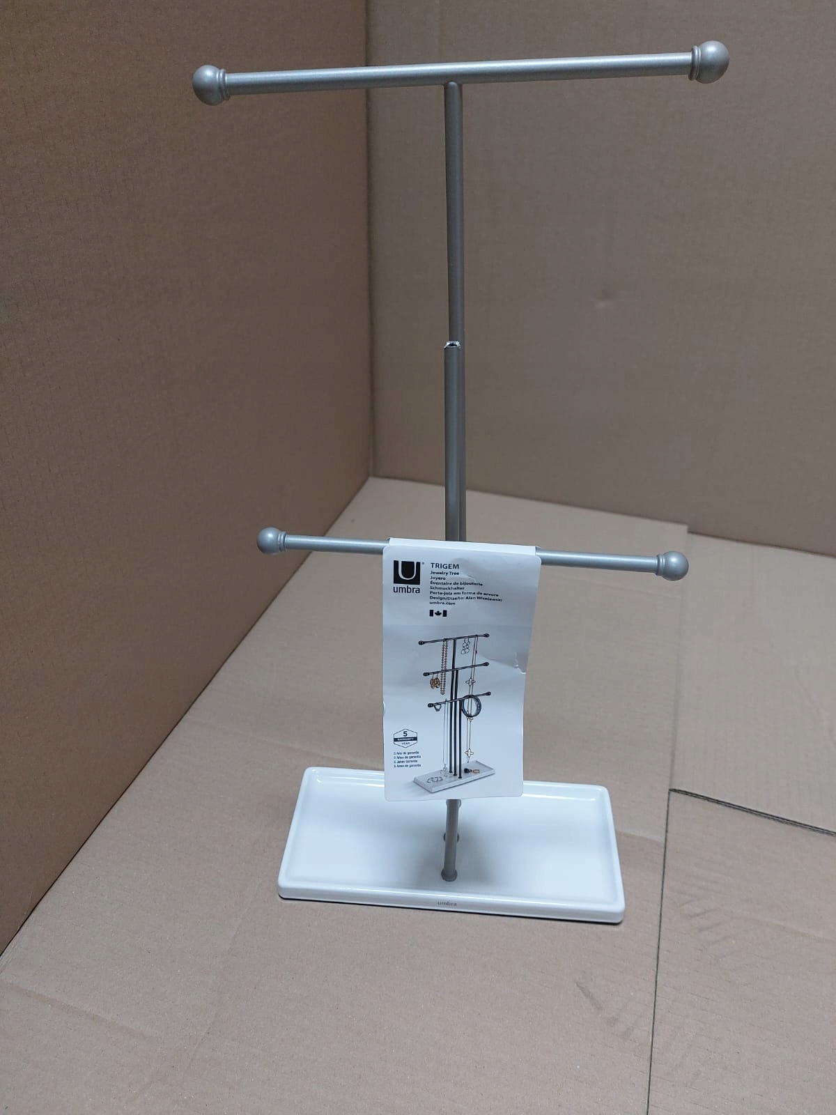 Бренд Umbra подготовил идеальное предложение для каждой женщины – стенд Trigem. На него можно повесить украшения: цепочки, бусы, колье и браслеты, а на подставку разместить кольца или обручальные кольца. Подставка состоит из основания и трех металлических опор, окрашенных в серебристый цвет.
