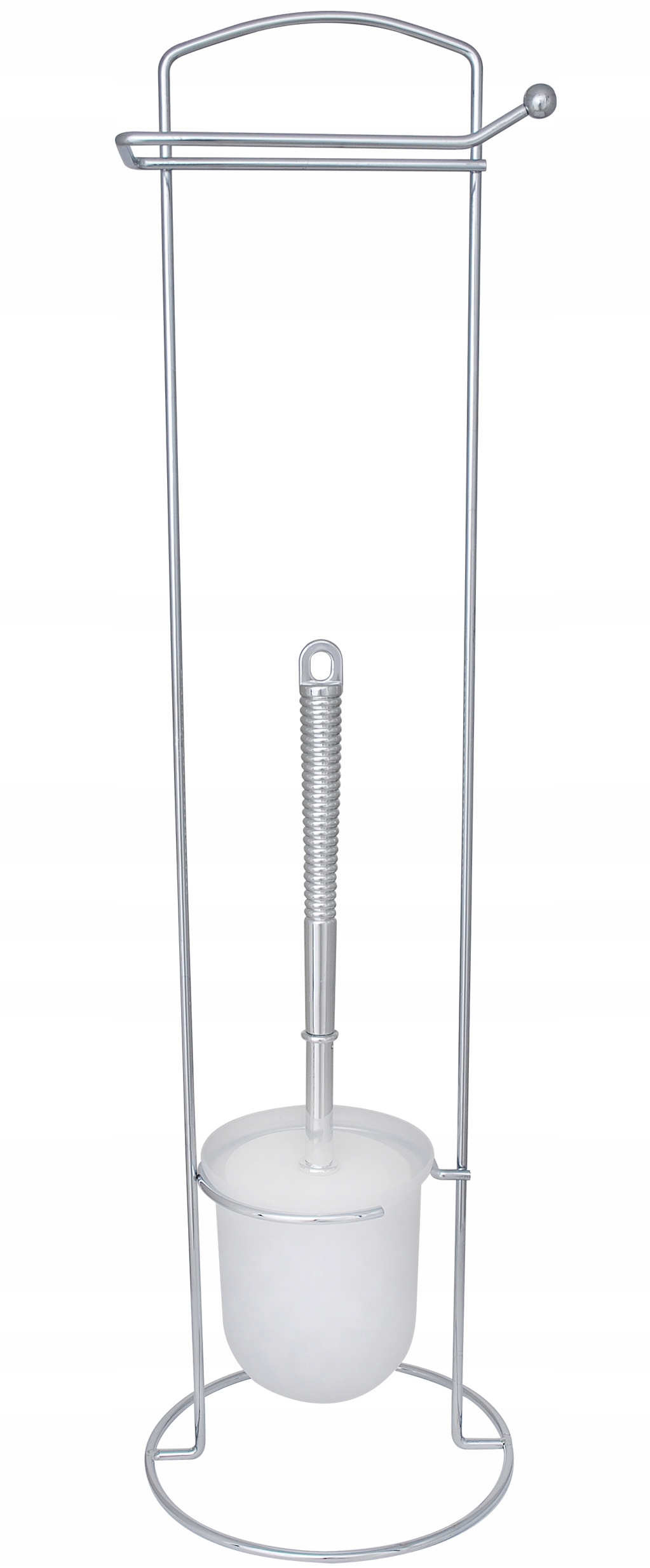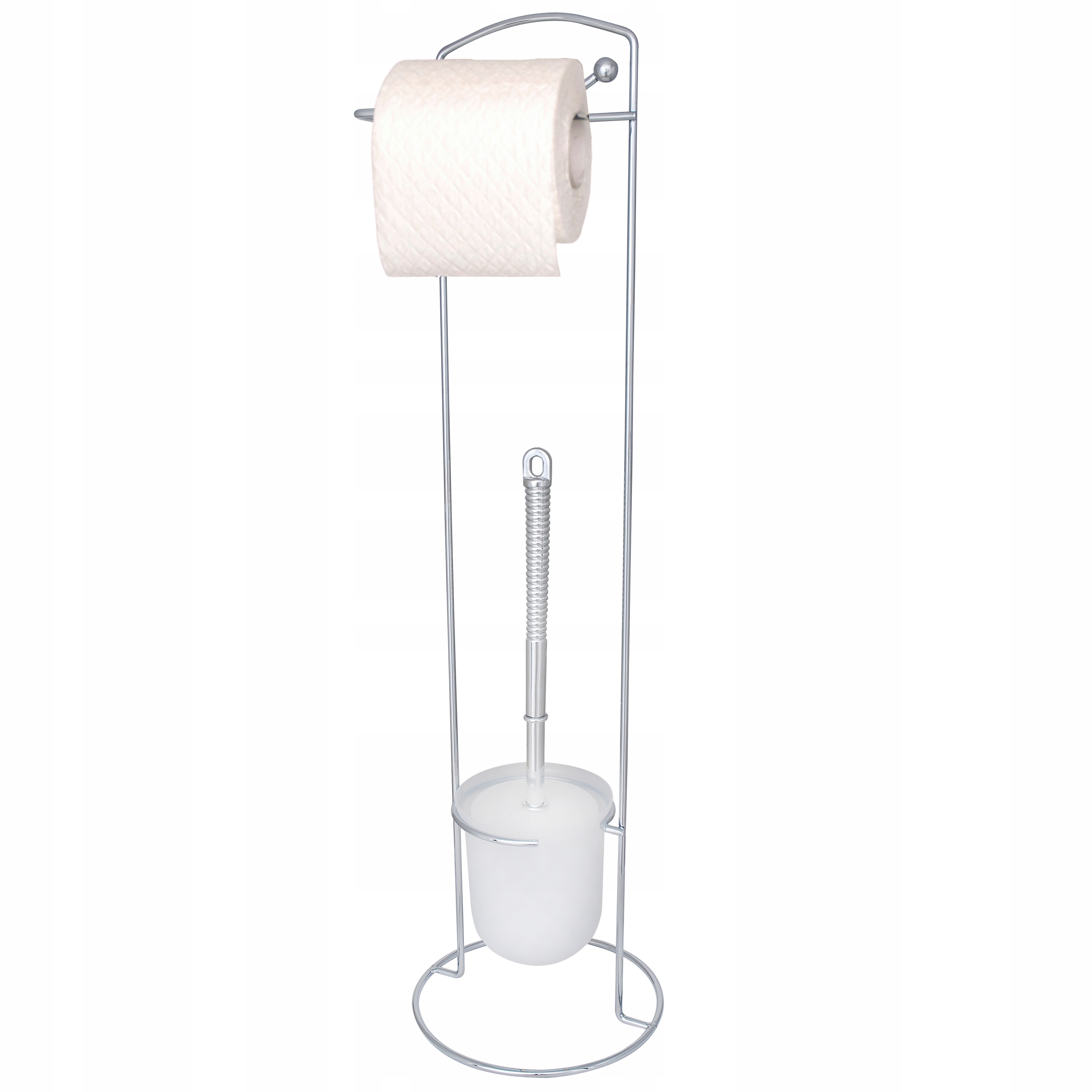 Практическая туалетная стойка с туалетной щеткой и туалетной бумажной вешалкой. Подставка изготовлена из высококачественной стальной проволоки, покрытой хромированным покрытием. Контейнер для пластиковой щетки, напоминающего матового стекла по внешнему виду. Контейнер может быть удален (например, для очистки каждого элемента). Туалетная щетка имеет белую резиновую крышку для контейнера и серебряная, блестящая ручка.
