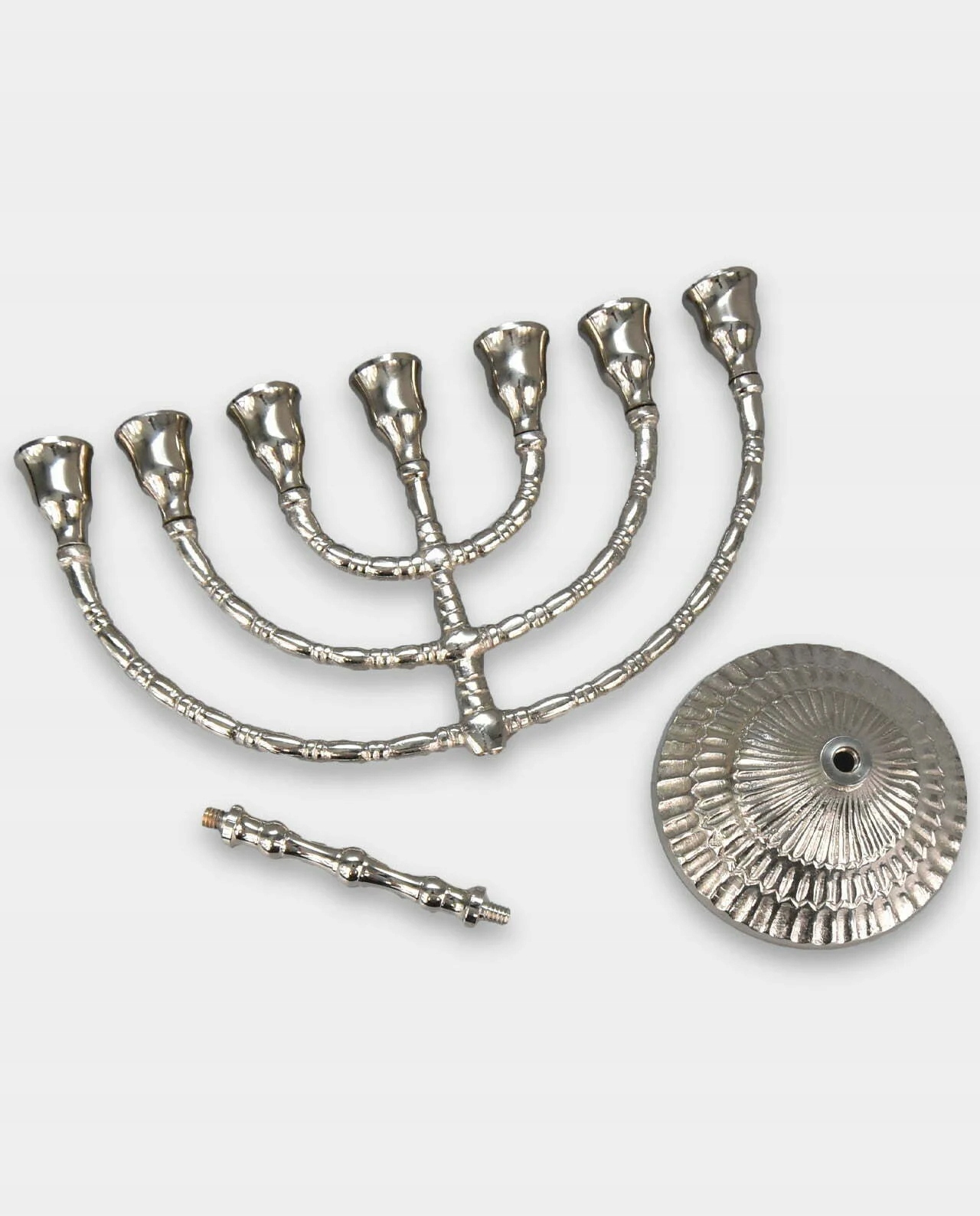 Уникальный семирожковый канделябр из никелированного металла. Красиво сделано, очень точно, с вниманием к мельчайшим деталям. Он производит большое эстетическое впечатление и имеет вневременной стиль. Подходит для многих интерьеров. Это позволяет получить атмосферный свет. Используется в церемониальных целях в еврейской культуре. Легко транспортировать благодаря возможности разборки отдельных элементов, что делает его идеальным подсвечником для путешествий.