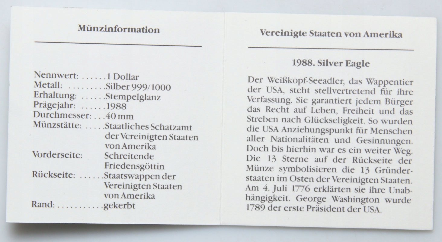 США - монета 1 унція Ag 999 срібло - 1 долар 1988 + КОРОБКА + СЕРТИФІКАТ
