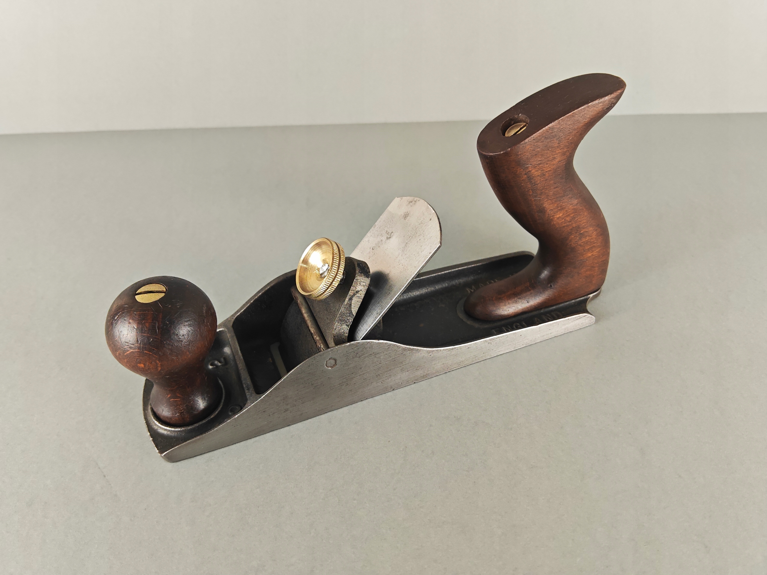 Интересно, маленький удобный поток, подписанный в Англии № 2, как правило, все в порядке, металлическая нога, все трещины, деревянные ручки в порядке, латунные винты на ручках и блокировку лезвия, блокада лезвия работает правильно. Хорошая старая копия.