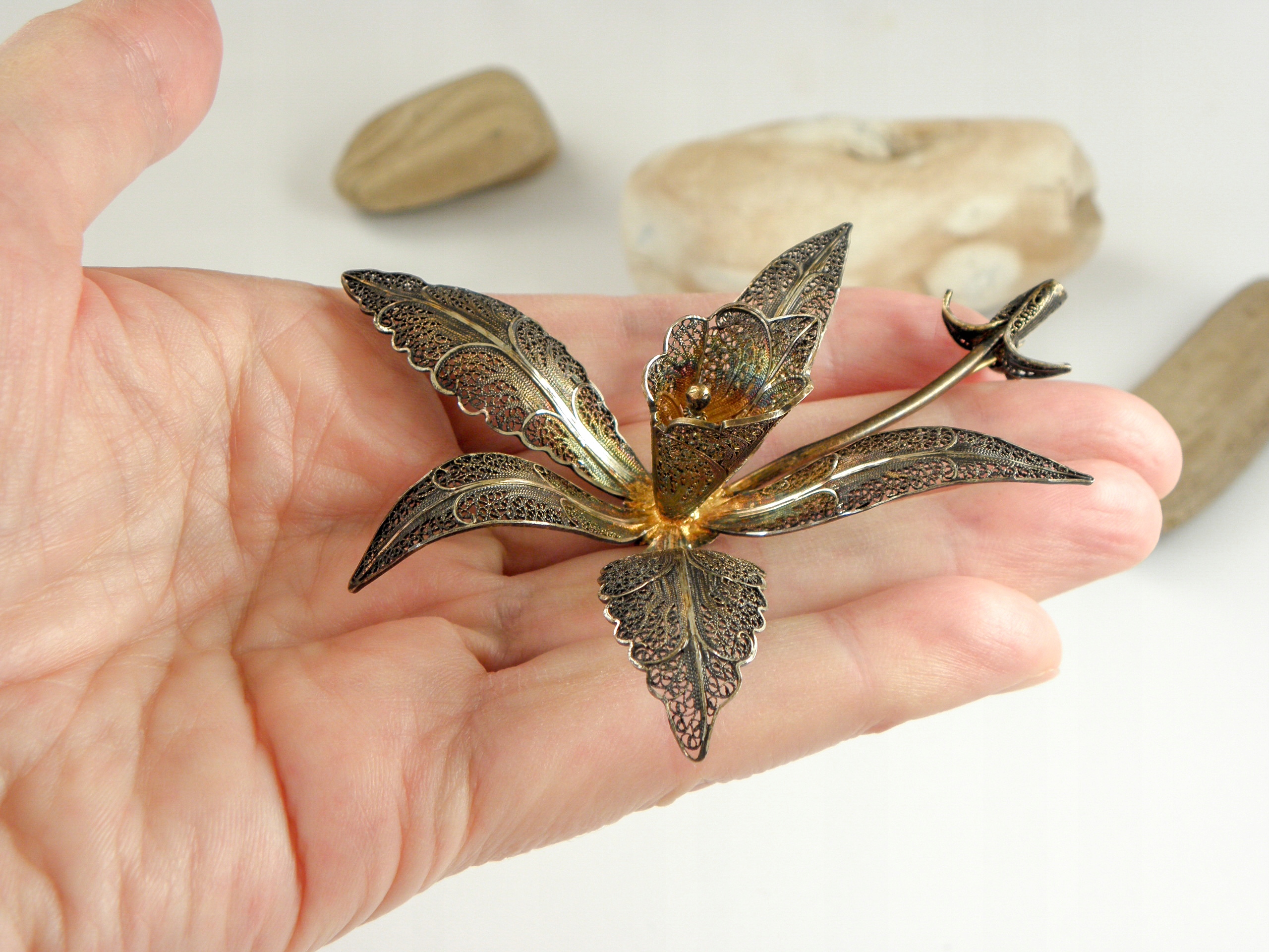 STARA BROSZKA ORCHIDEA AŻUR FILIGRAN SREBRO