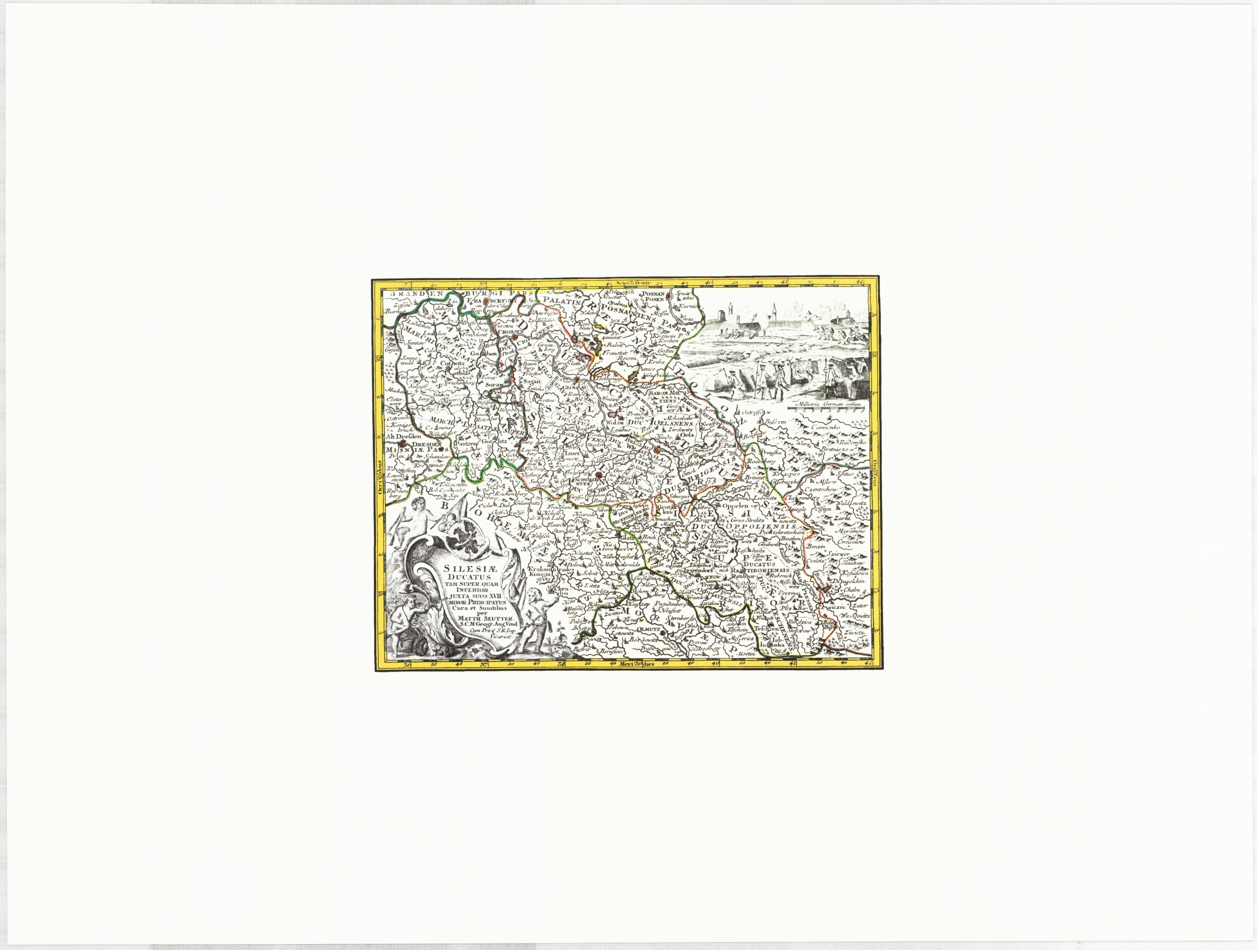 Обзорная карта Силезии, опубликованная в аугсбургском издательстве Маттеуса Скаттера (1678–1756), вероятно, во время Силезских войн. Об этом свидетельствует картуш в правом верхнем углу, изображающий осадные сооружения города-крепости. Были проведены границы, в том числе границы между Нижней и Верхней Силезией (в которую входило также Нысское герцогство) и административно-политическое деление региона, восходящее к австрийскому периоду, на княжества и свободные поместья. Линейный масштаб: 9 миль [немецкий] = 4 см, разм. 26 см х 20 см, гравюра на меди, jbw, цветной бордюр, бумага ручной работы. Государственный архив в Катовице, Филиал в Гливице, Картографическая коллекция, исх. 261.